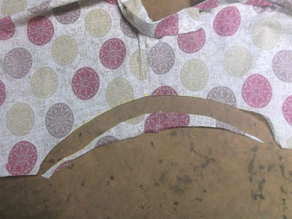 7枚目は後ろ身ごろを見本の幅に合わせて生地をカットした後の写真です。