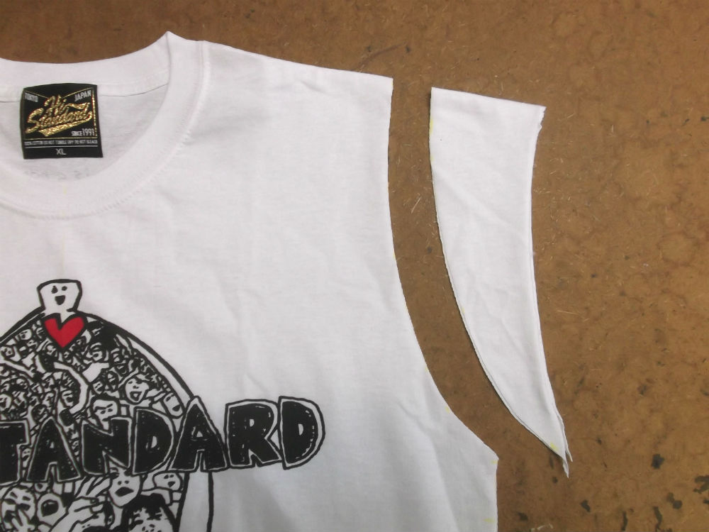3枚目は左右の袖のパーツをアームホールの縫い目から外した後のTシャツの胴体です。