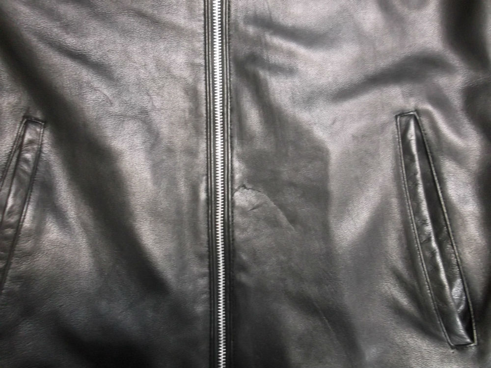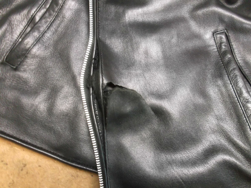2枚目はファスナー付近の破れたレザージャケットの写真です。