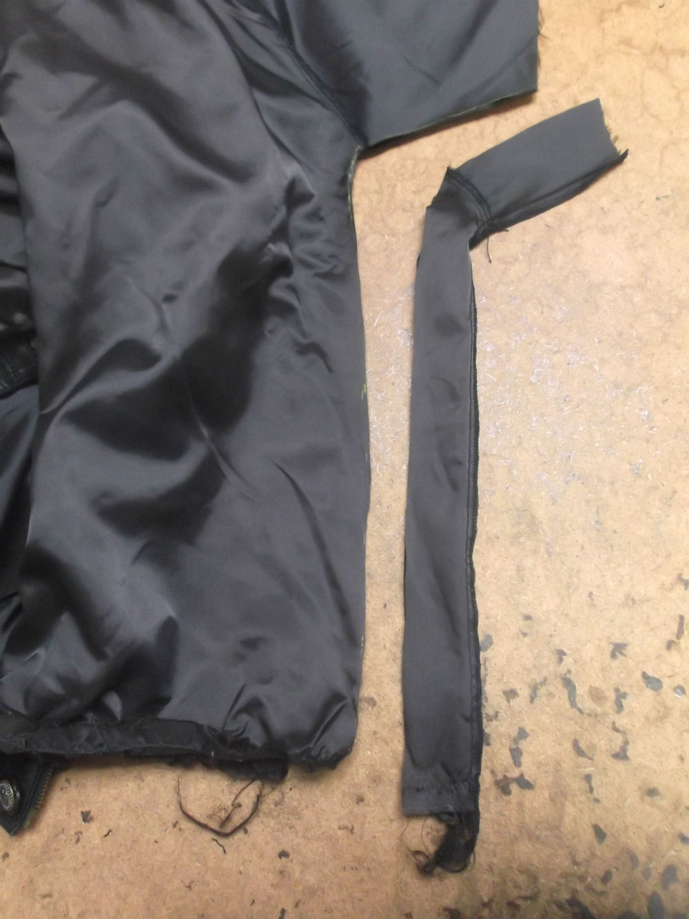 裏地が破れたレザージャケットを新しい生地に交換と袖丈直し 革ジャン裏地取り換え袖丈詰め修理