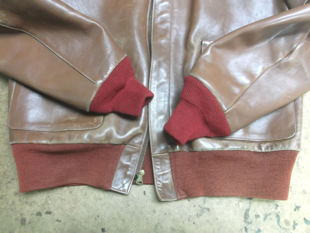 1枚目は長崎県からの郵送のお客さんの左右の袖のリブニットを交換していく前のA-2フライトジャケットです。