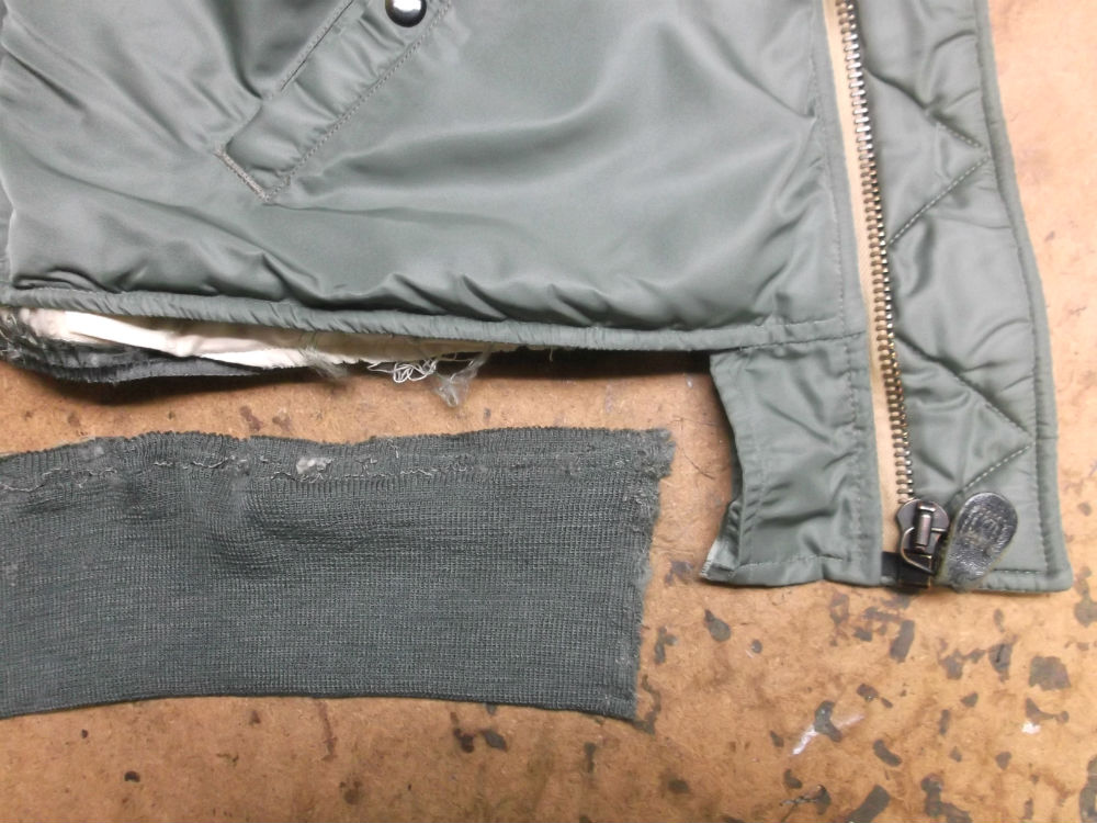 縮んで破れだしたMA-1フライトジャケットのリブニットを新しいものに交換していきます。