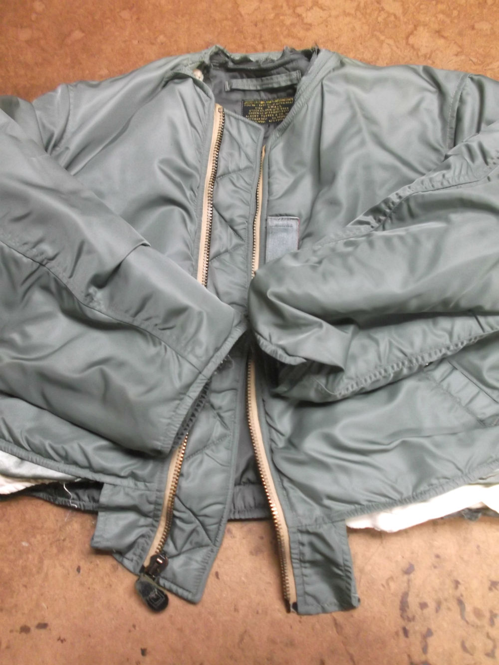 1枚目は神奈川県からの郵送のお客さんの襟、袖、腰回りのリブニットを交換していく前のMA-1フライトジャケットです。