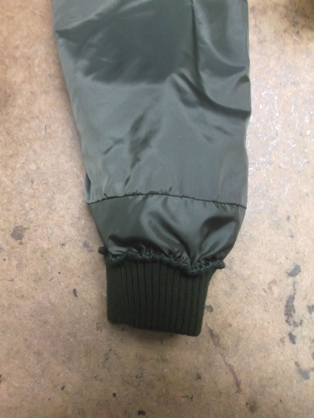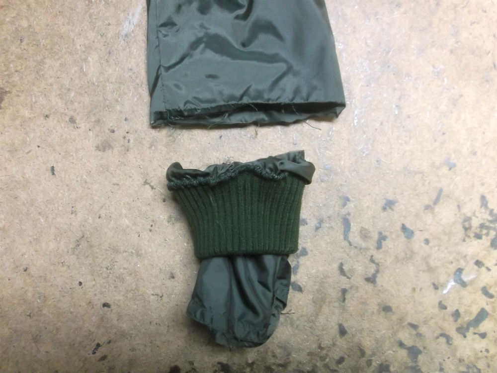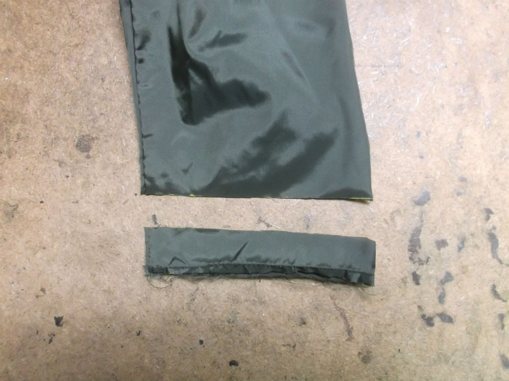 7枚目は裏地のリブニットのパーツの上の生地をお客さんの好みの長さの袖丈になる様にカットしていきます。