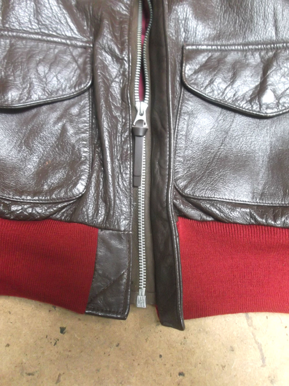 31枚目はA-2フライトジャケットに取り付けた両袖と腰回りのリブニットの写真です。