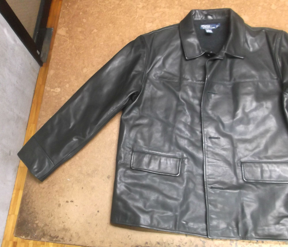 長い袖丈のラルフローレンのレザージャケットをお客さんの好みの長さに短くリサイズしていきます。
