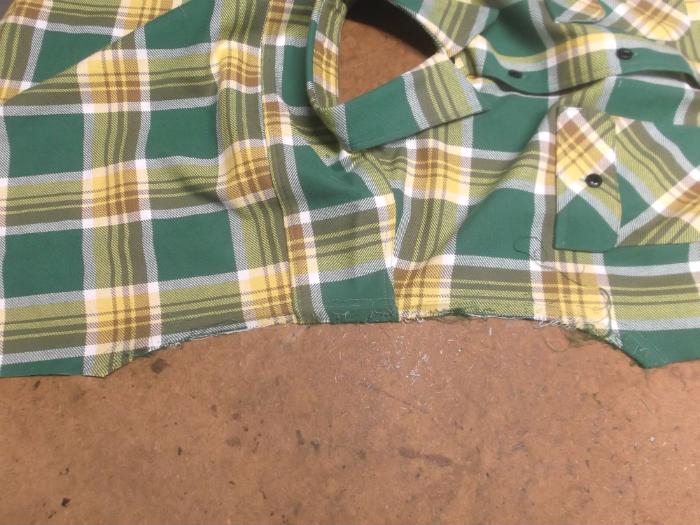 10枚目はシャツの胴体の着丈以外の肩幅、身幅、裾幅の生地をカットした後の写真です。