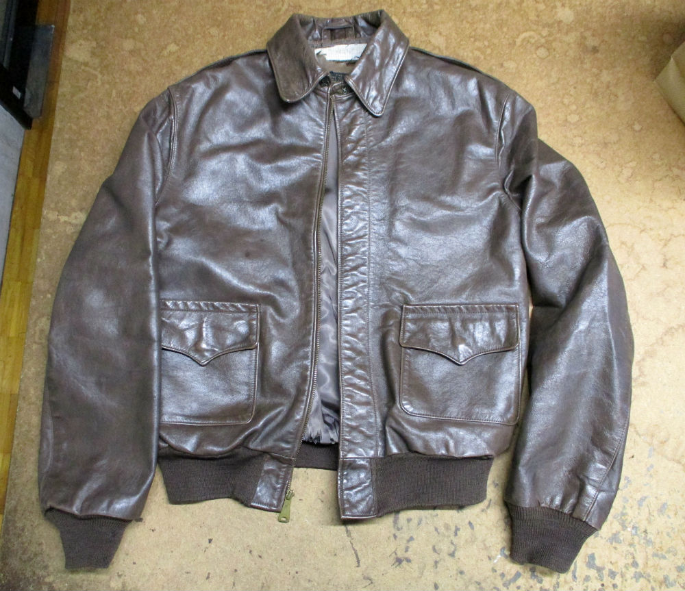 1枚目は福岡県からの郵送のお客さんの両袖と腰回りのリブニットと裏地を交換していく前のA-2フライトジャケットです。