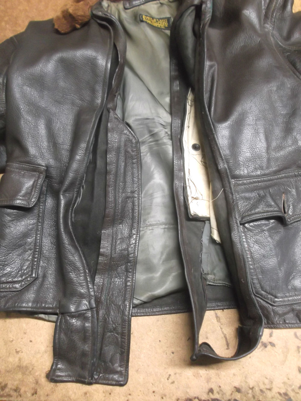 1枚目は東京都からの郵送のお客さんの両袖と腰回りとジッパーを交換していく前のG-1フライトジャケットです。