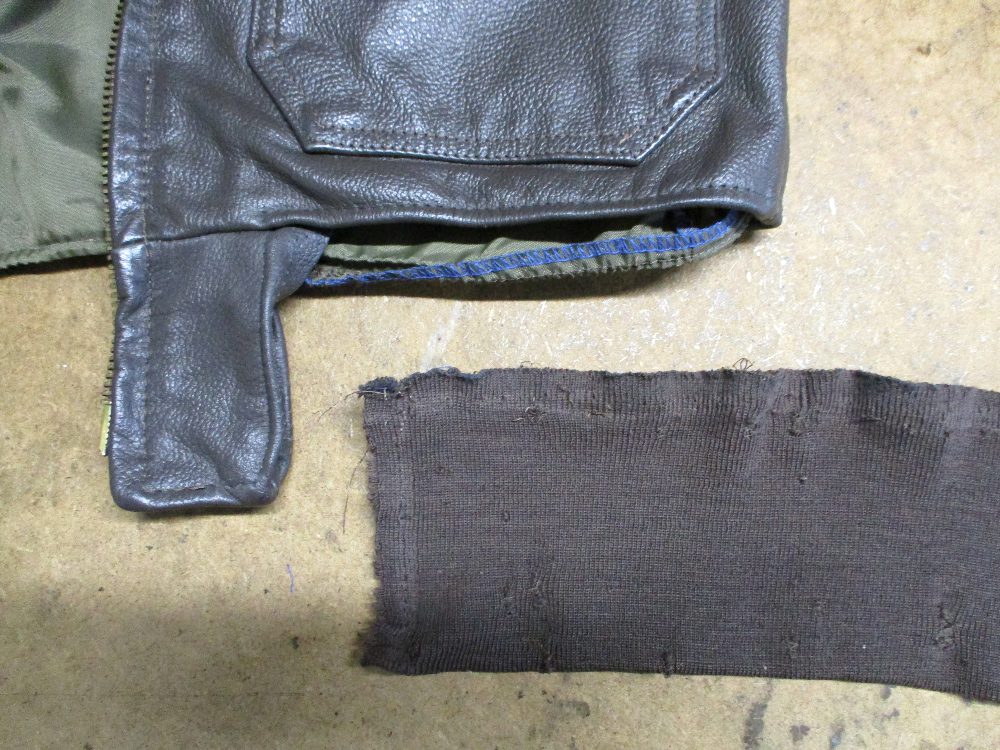 G-1フライトジャケットに映画トップガンのワッペンと両袖と腰回りに新しいリブニットに交換していきます。