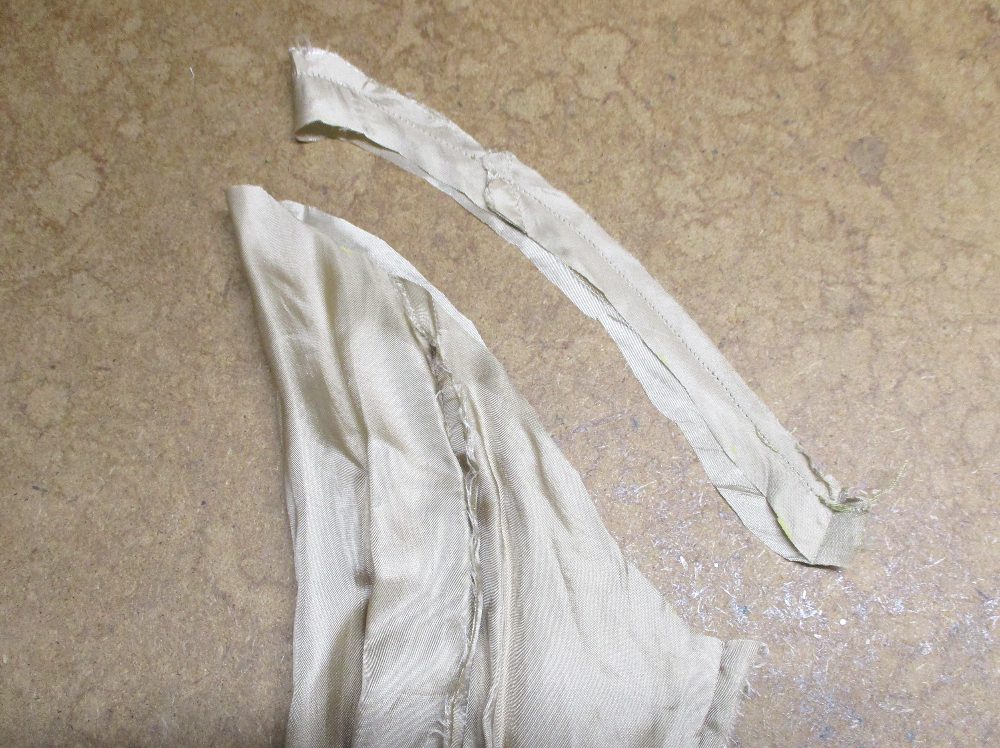 7枚目は裏地の袖山から生地をカットした写真です。