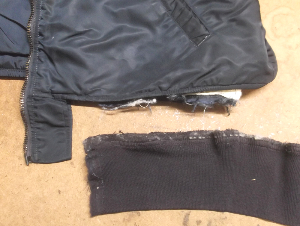 B-15フライトジャケットの両袖と腰回りの破れだしたリブニットを新しいものに交換していきます。