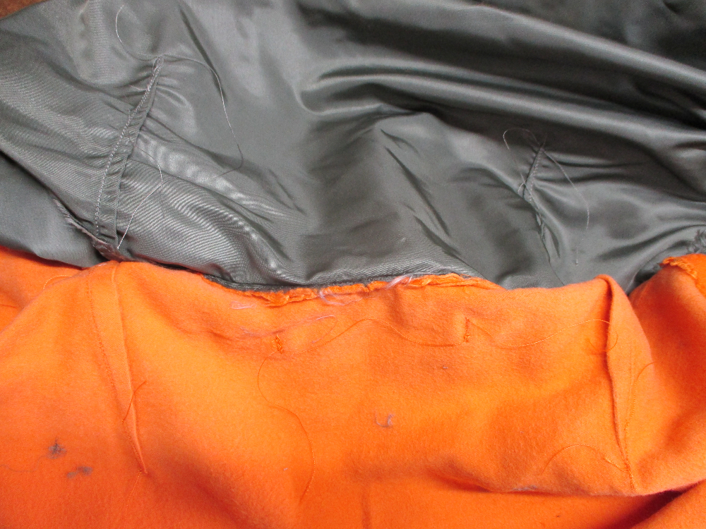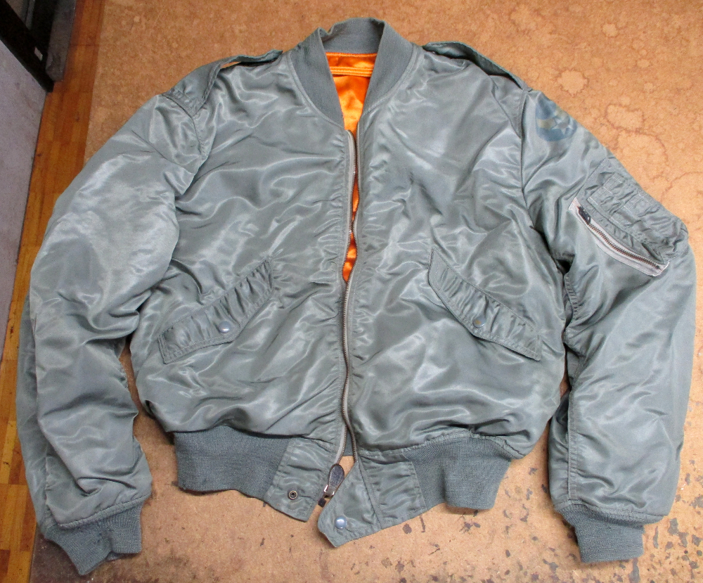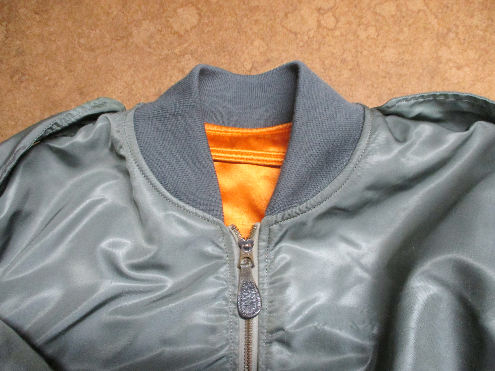 1枚目は滋賀県からの郵送のお客さんの襟、両袖、腰回りのリブニットを交換していく前のL-2Bフライトジャケットです。
