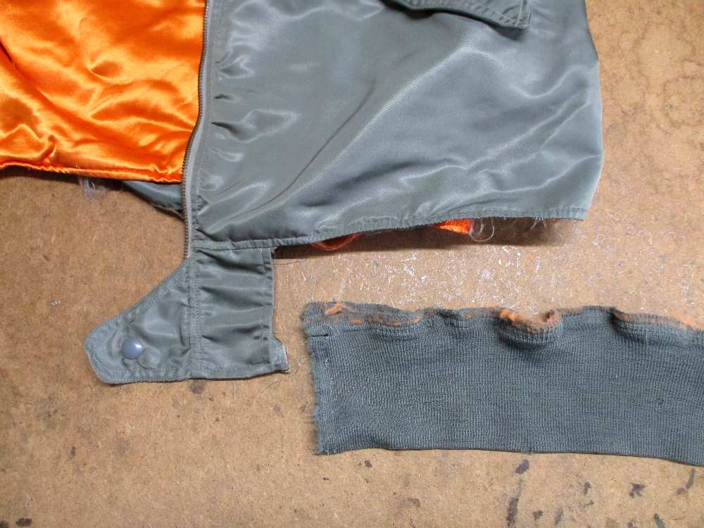 12枚目はL-2Bフライトジャケットから襟、両袖、腰回りのリブニットを取り外した写真です。