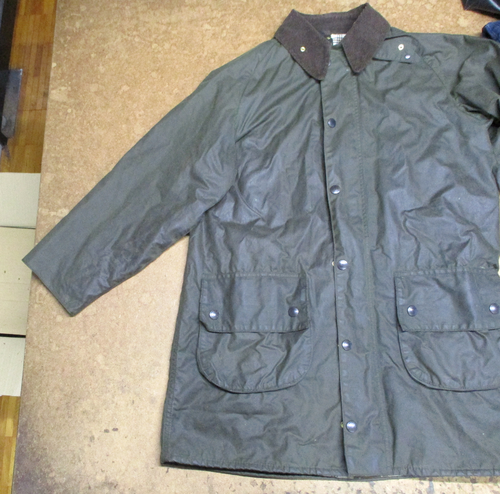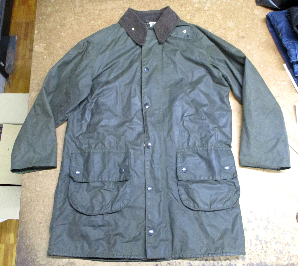 1枚目は来店されたお客さんの長い袖丈を短くしていく前のバブアーのオイルドジャケットです。
