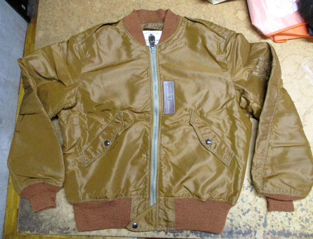1枚目は京都府からの郵送のお客さんの襟、両袖、腰回りのリブニットを交換していく前のL-2フライトジャケットです。
