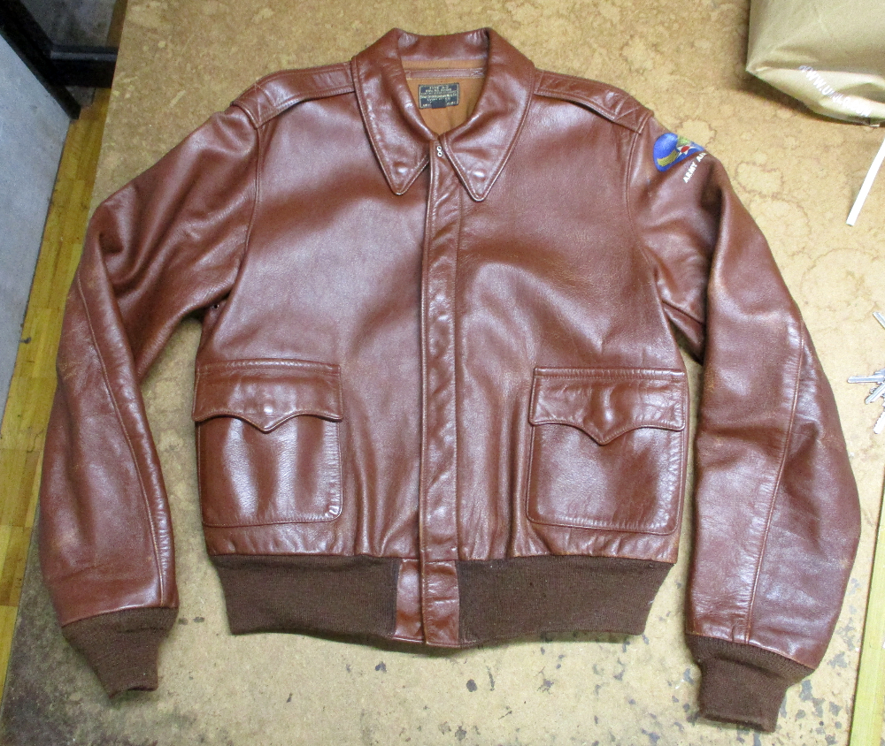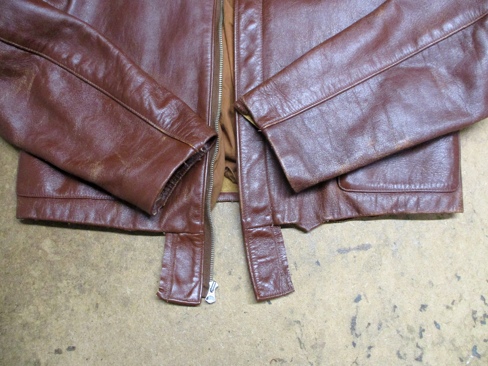 1枚目は三重県からの郵送のお客さんの両袖と腰回りのリブニットを交換して肩に革パッチを取り付けていく前のA-2フライトジャケットです。
