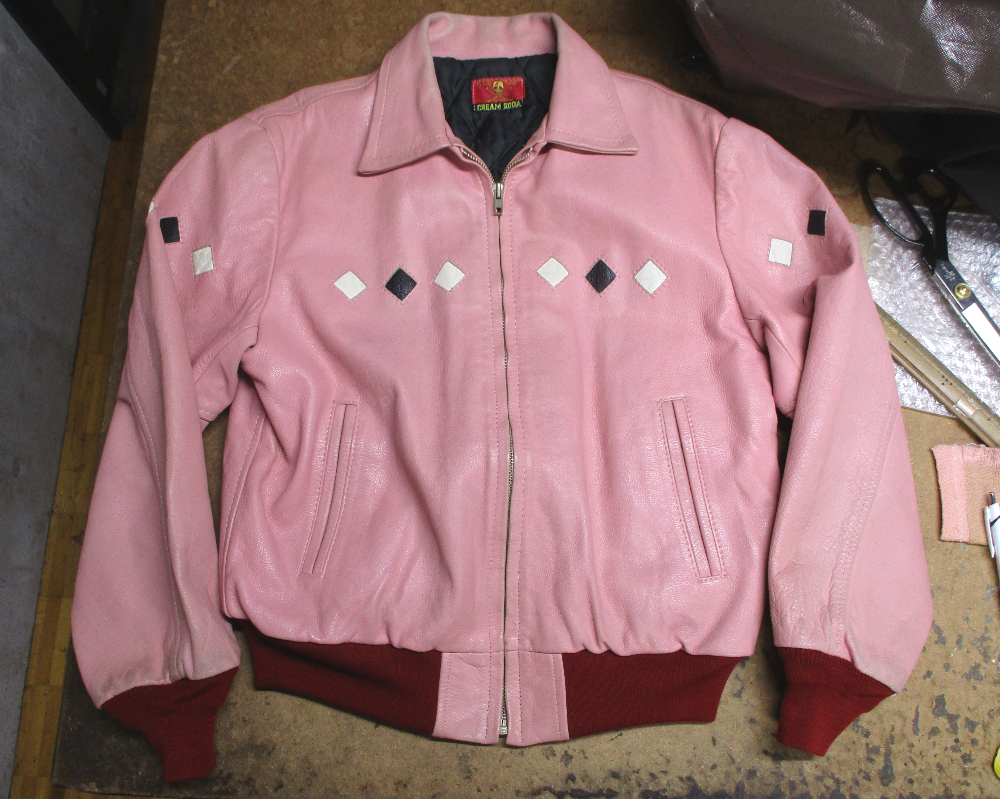 12枚目は両袖と腰回りに新しくリブニットを取り付けたレザージャケットの写真です。