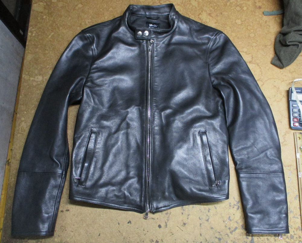 1枚目は東京都からの郵送のお客さんの長い袖丈を袖先から短くしていく前のレザージャケットです。