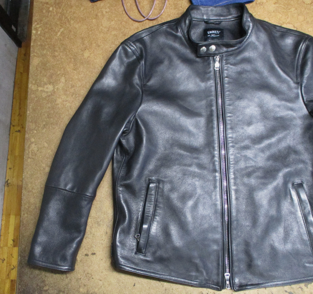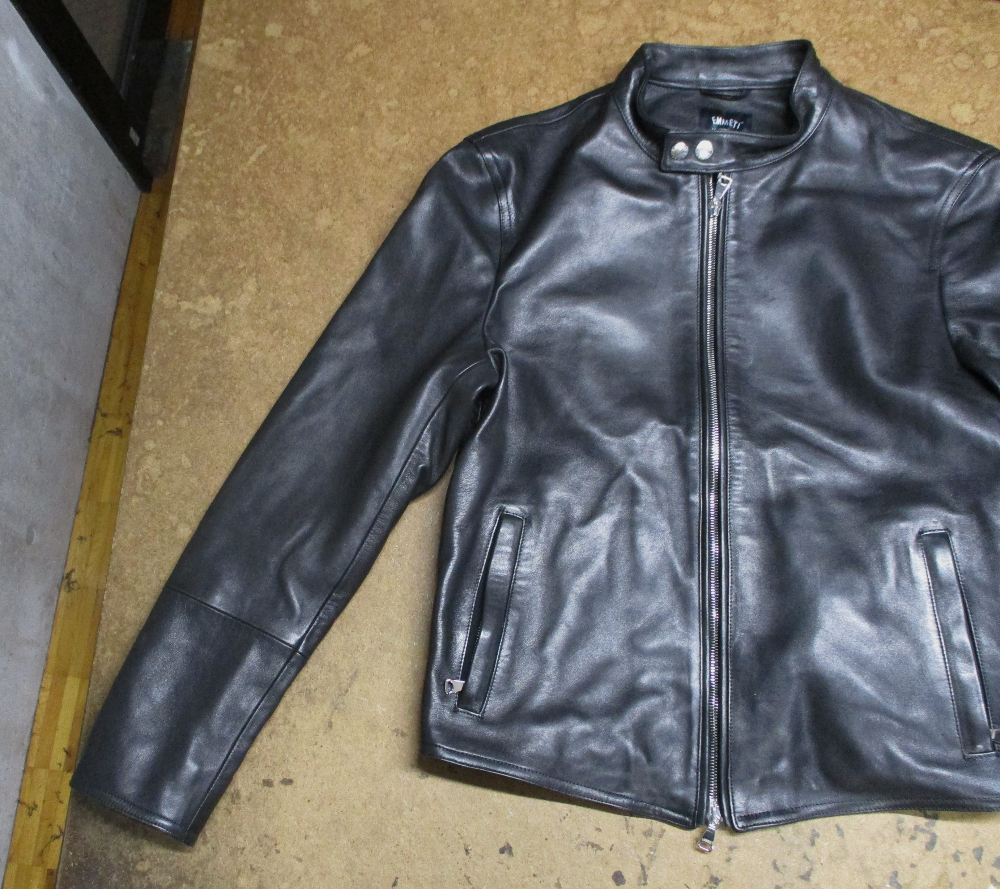 13枚目は14枚目との比較で袖先から袖丈を短くしていく前のレザージャケットです。
