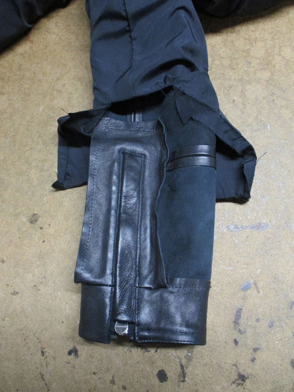 7枚目は袖先のパーツの上のレザーをカットして袖丈を短くしていきます。