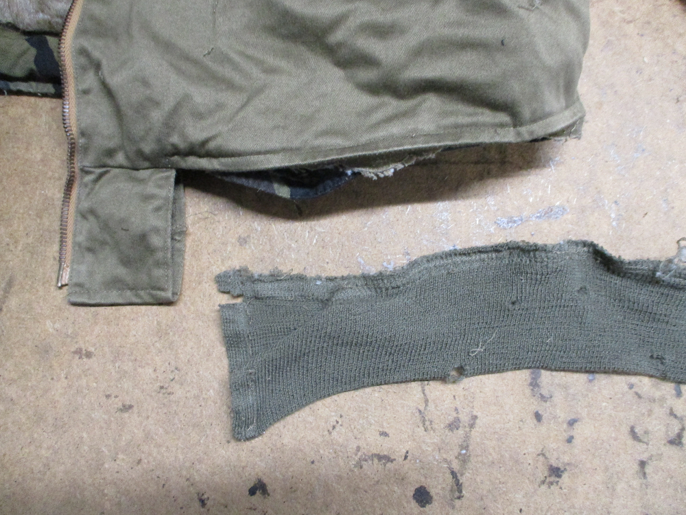 11枚目はB-15フライトジャケットの襟、両袖、腰回りのリブニットを取り外した写真です。