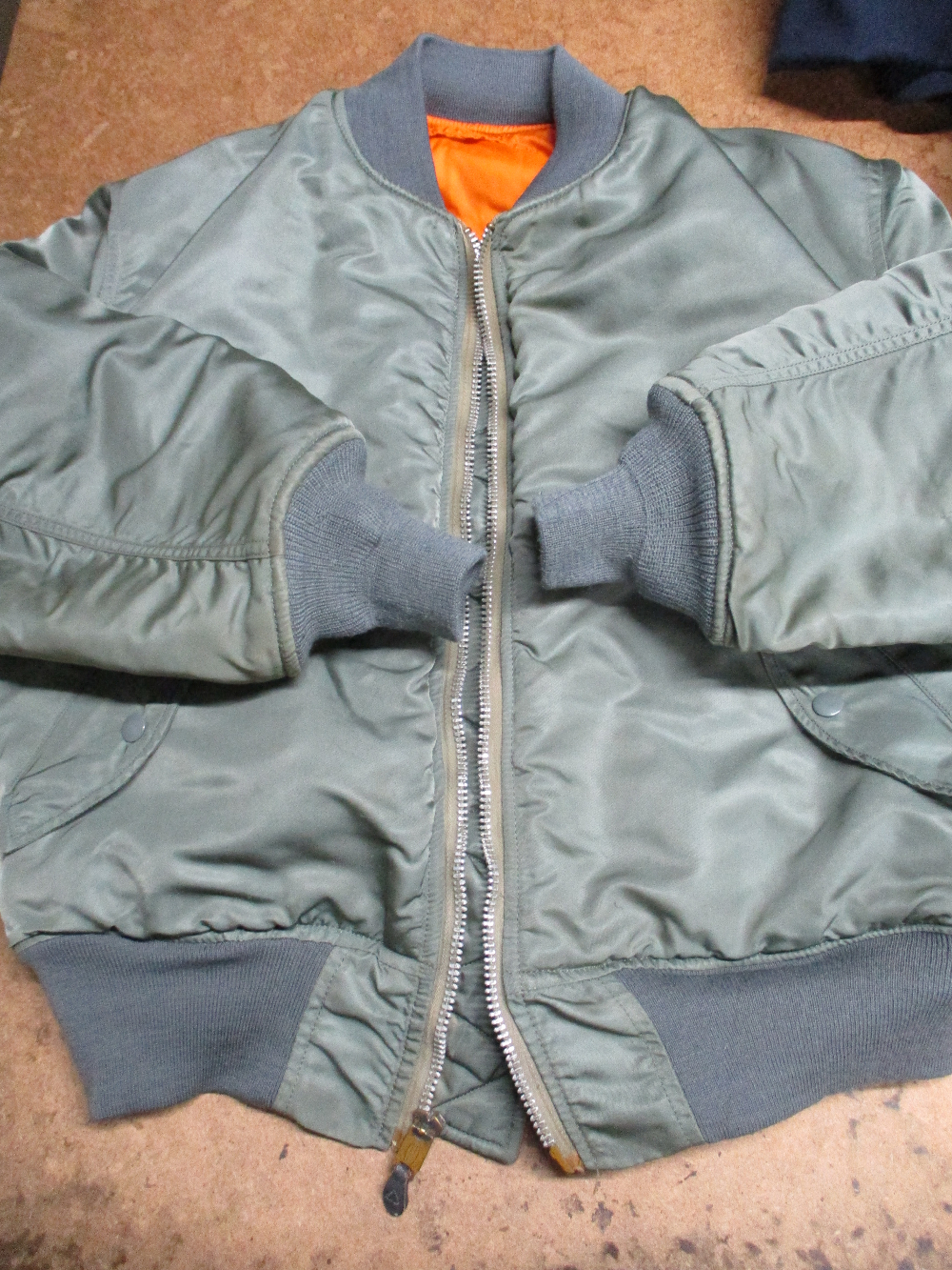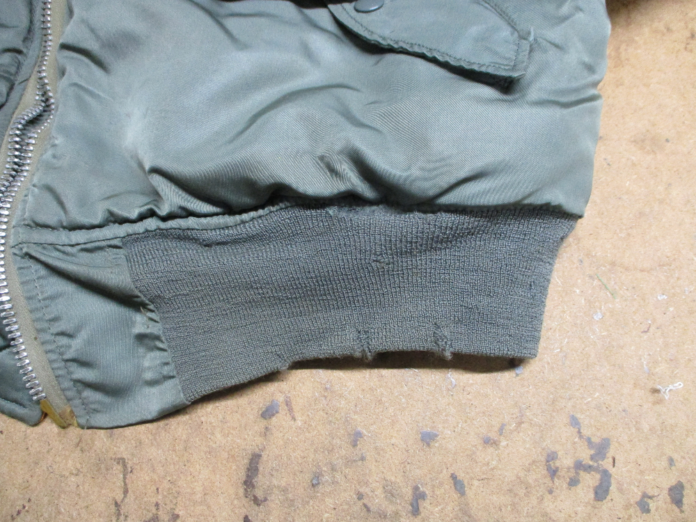 1枚目は来店されたお客さんの襟、両袖、腰回りのリブニットを交換していく前のMA-1フライトジャケットです。
