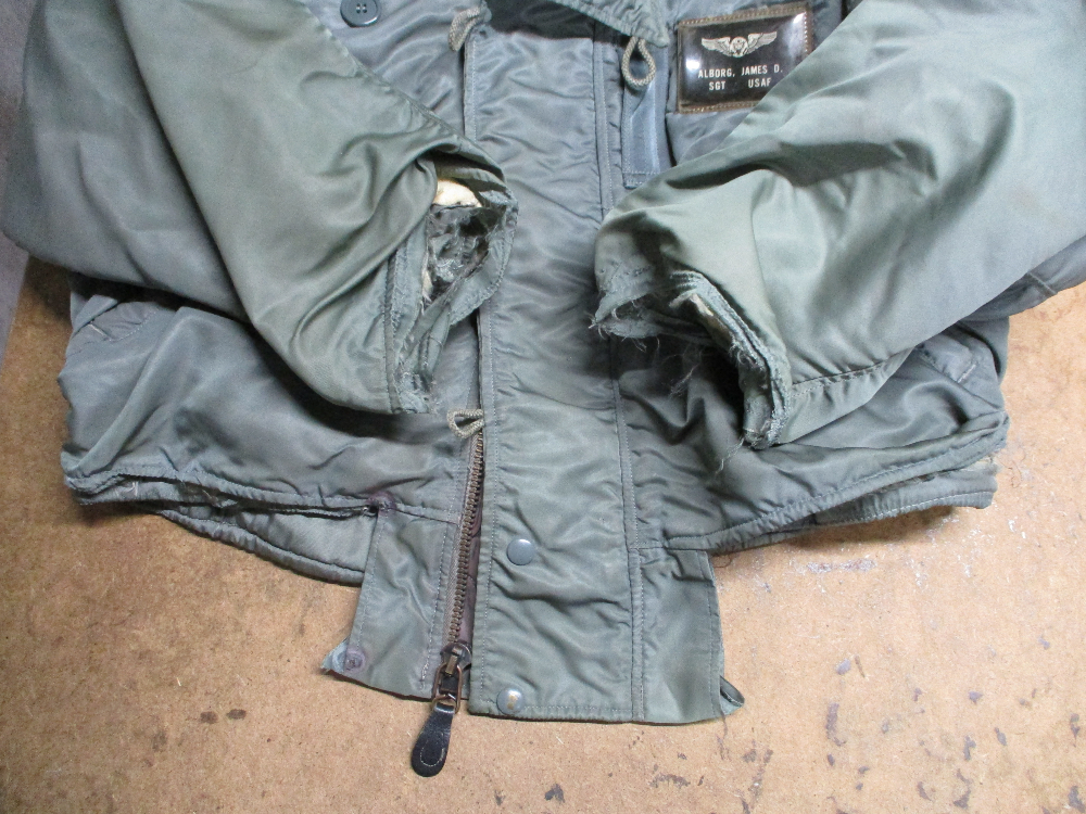 17枚目は両袖と腰回りのリブニットを新しくN-2Bフライトジャケットに取り付けた写真です。