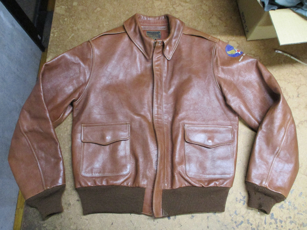 1枚目は来店されたお客さんの両袖と腰回りのリブニットを赤リブに交換していく前のA-2フライトジャケットです。