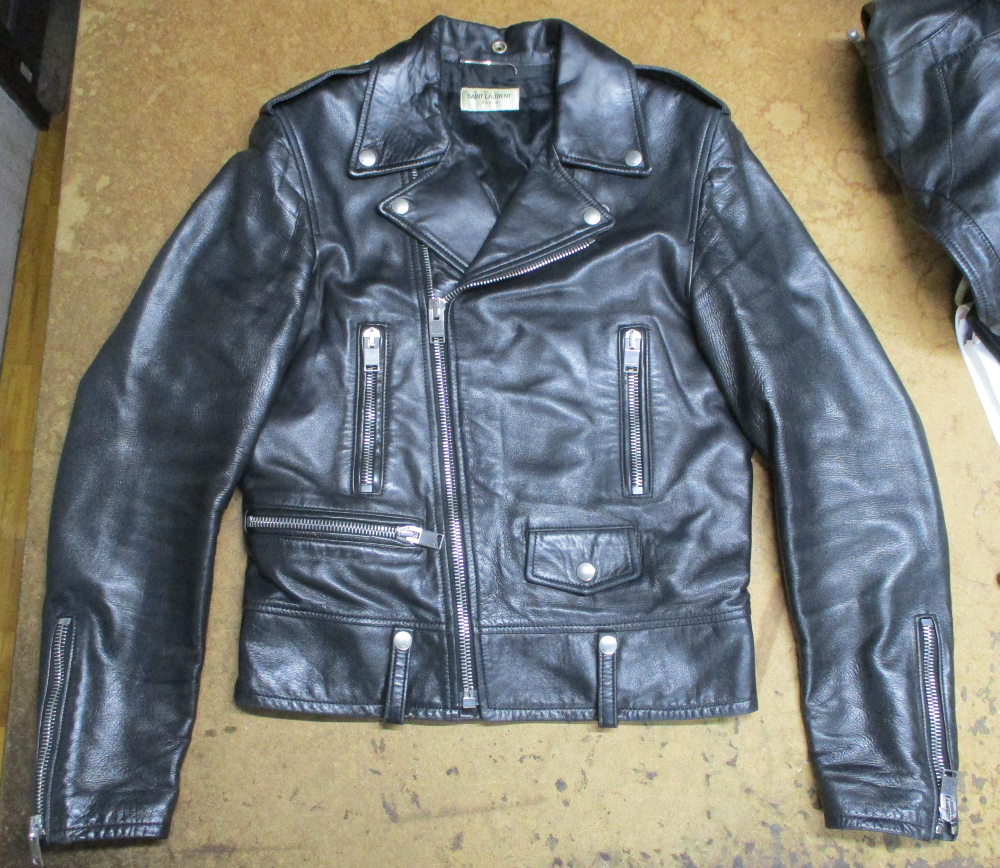 長い袖丈のサンローランのライダースジャケットをお客さんの好みの長さに短くリサイズしていきます。