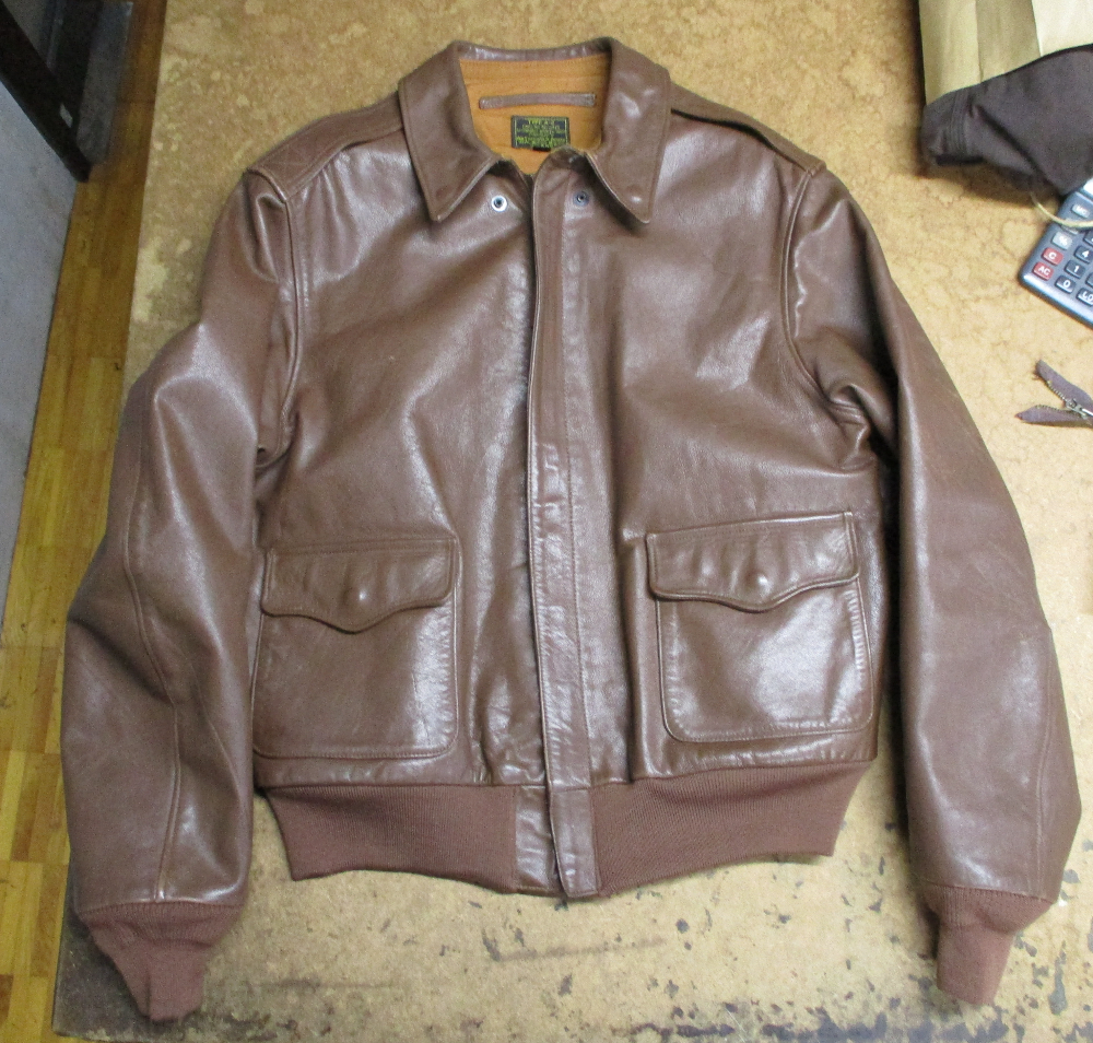 1枚目は神奈川県からの郵送のお客さんの両袖と腰回りのリブニットとフロントのファスナーを交換していくA-2フライトジャケットです。