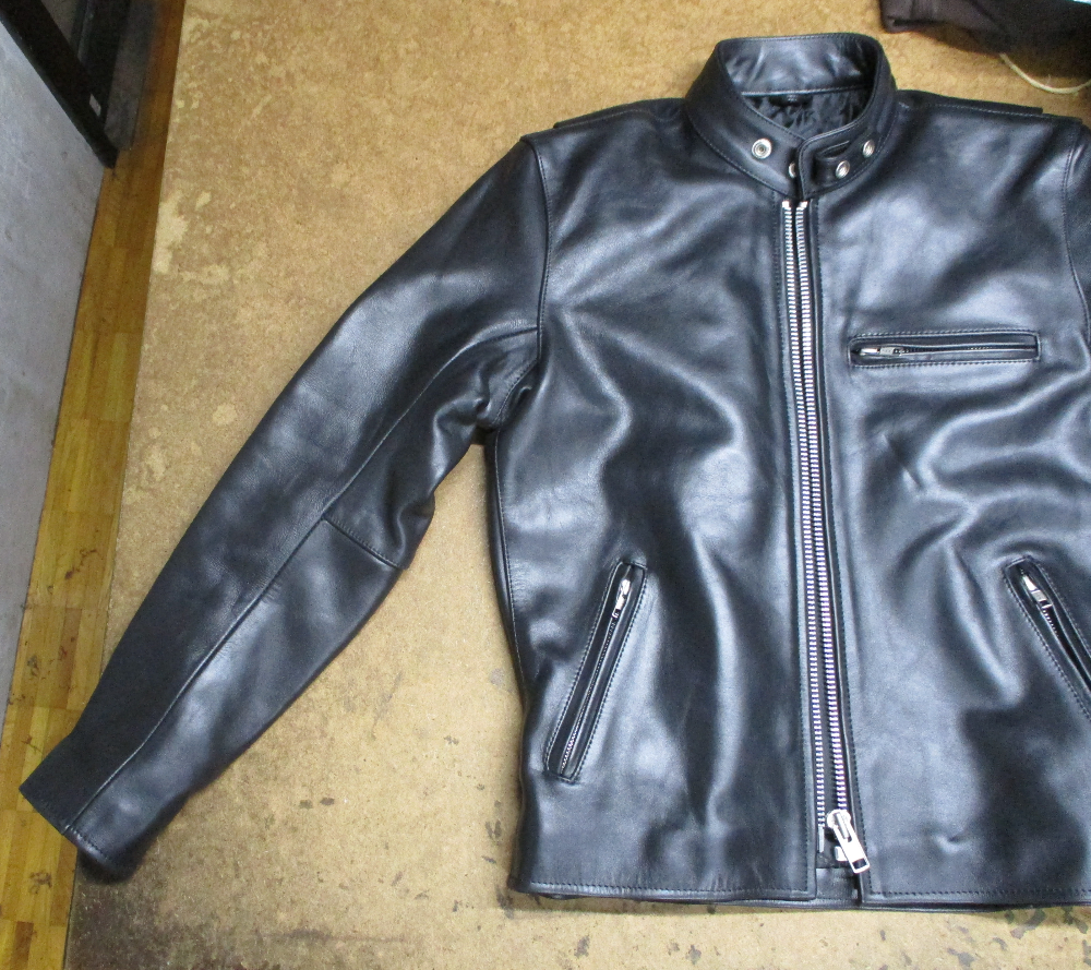 1枚目は京都府からの郵送のお客さんの袖丈を短くしていく前のレザージャケットです。