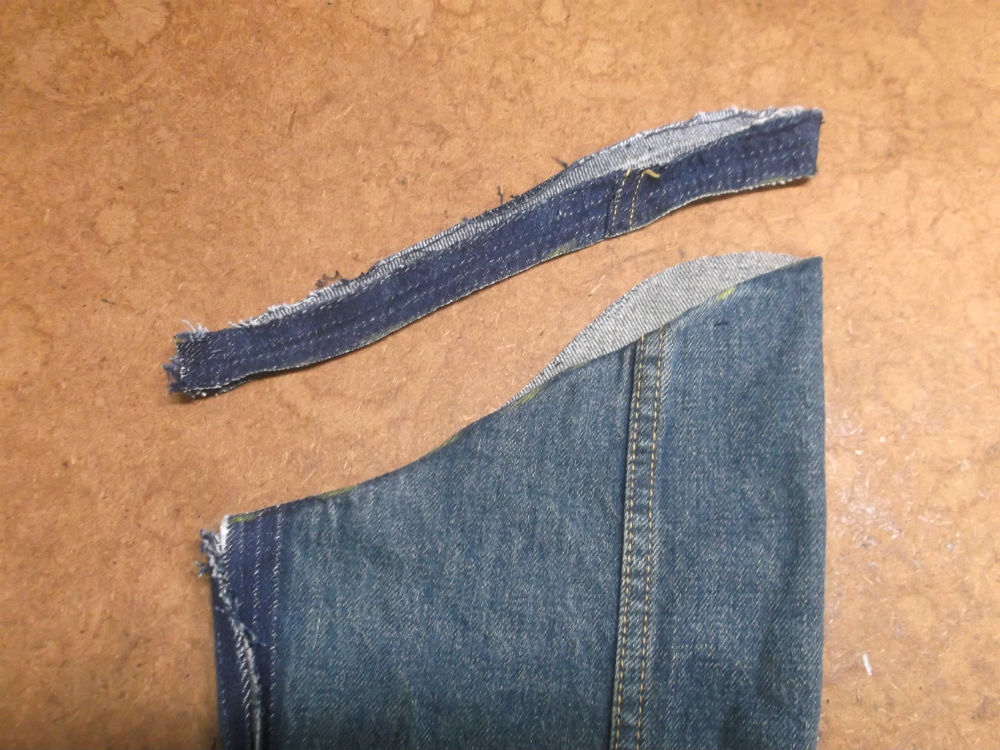 4枚目は袖山からデニム生地をカットして袖丈を短くしていきます。