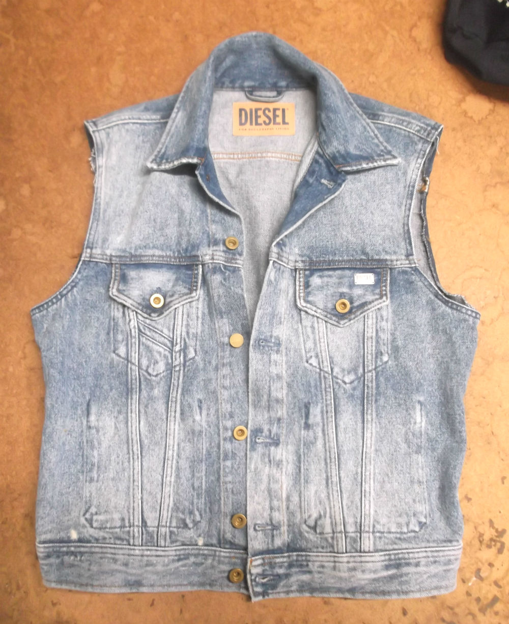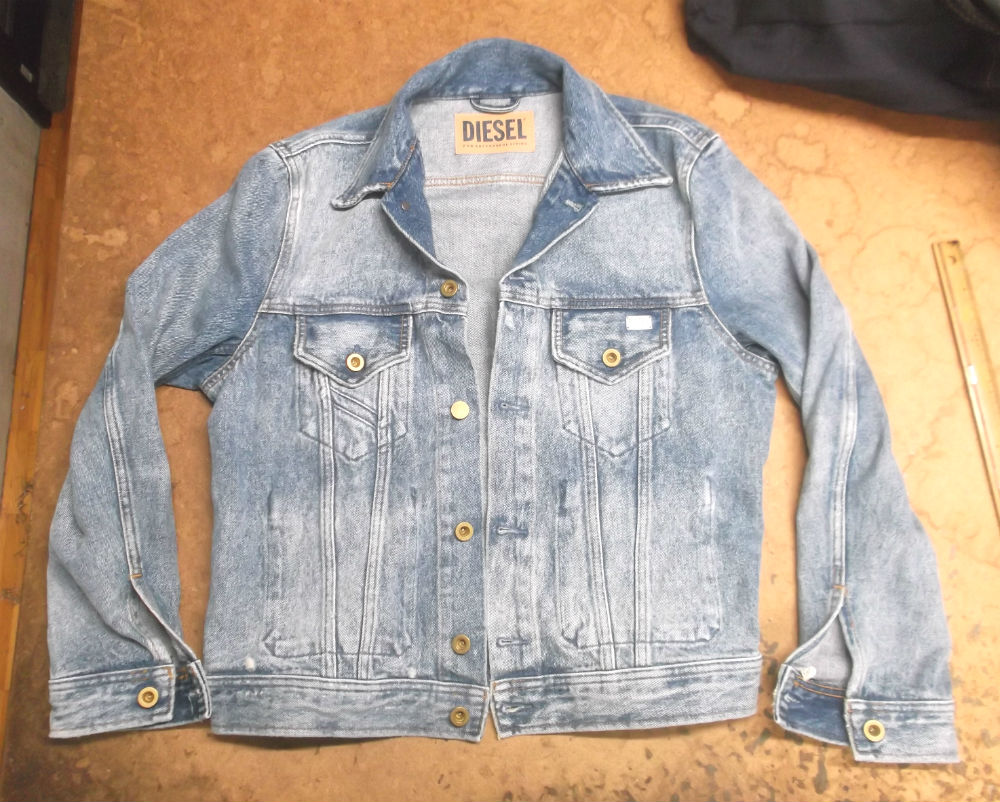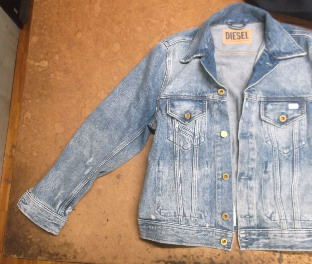 長い袖丈のディーゼルのGジャンをお客さんの好みの長さに短くリサイズしていきます。