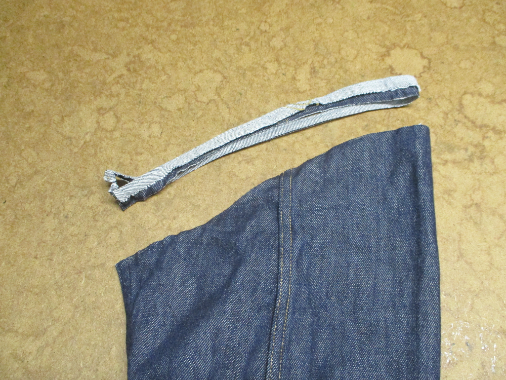 4枚目は袖山からデニム生地をカットして長い袖丈を短くしていきます。