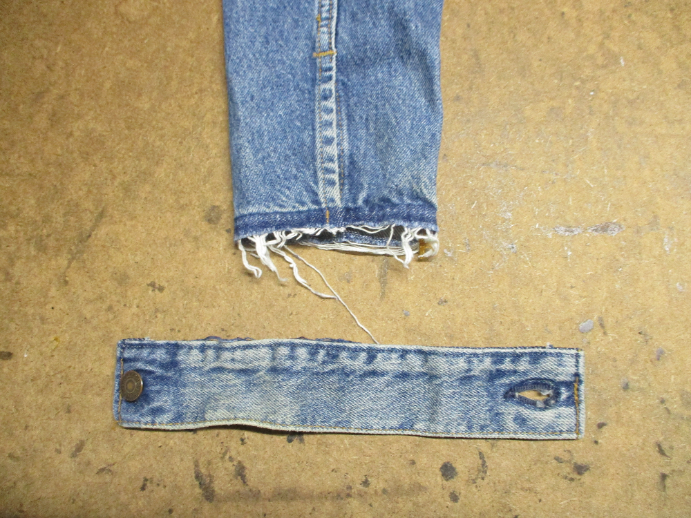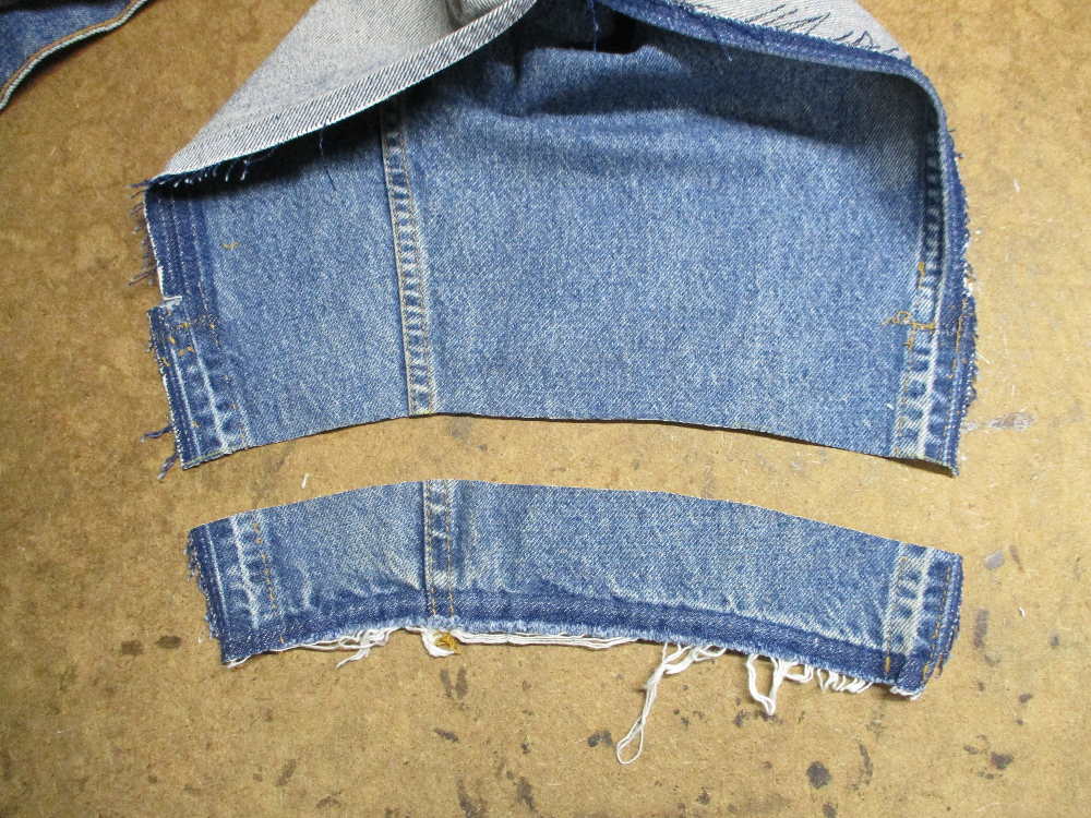 6枚目は袖先のデニム生地をカットして袖丈を短くしていきます。