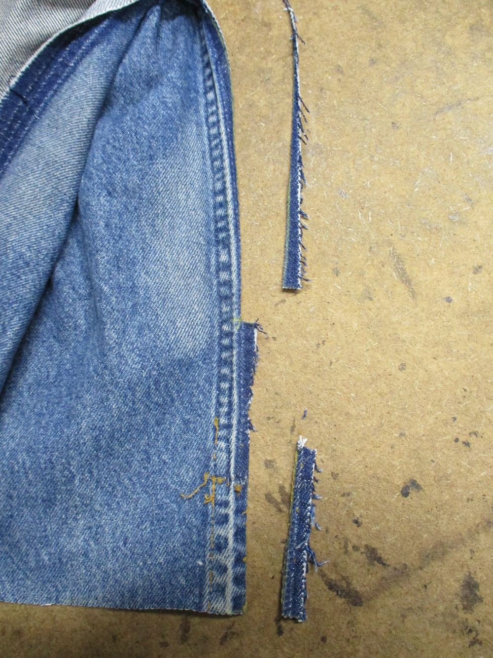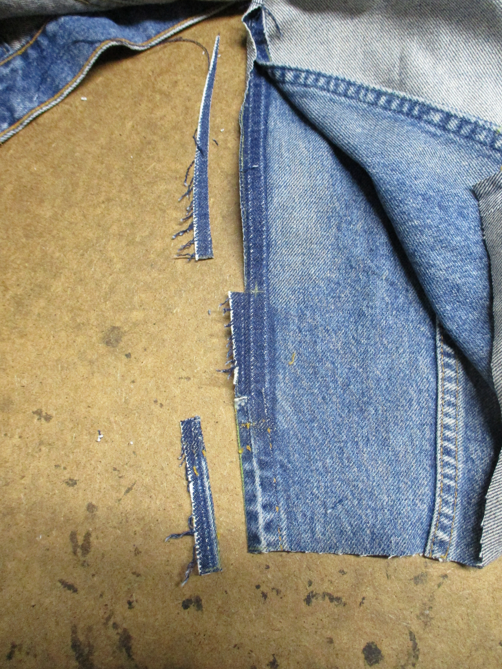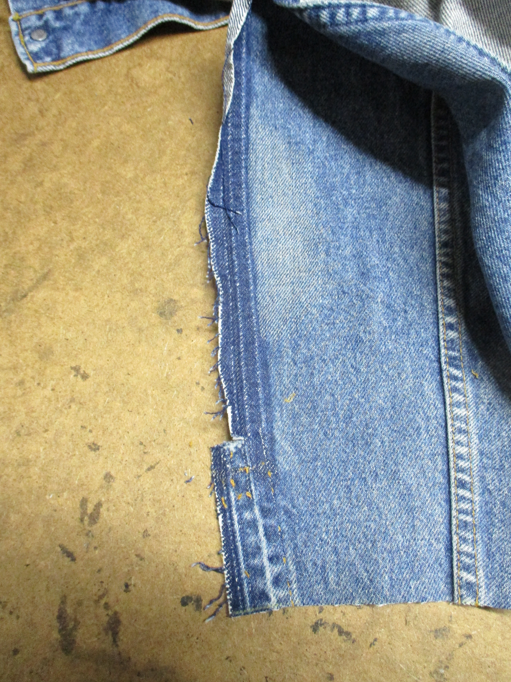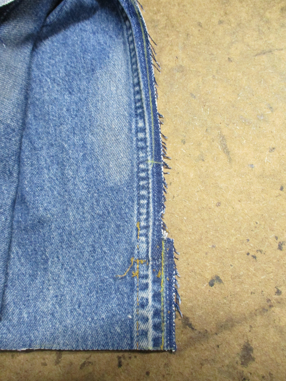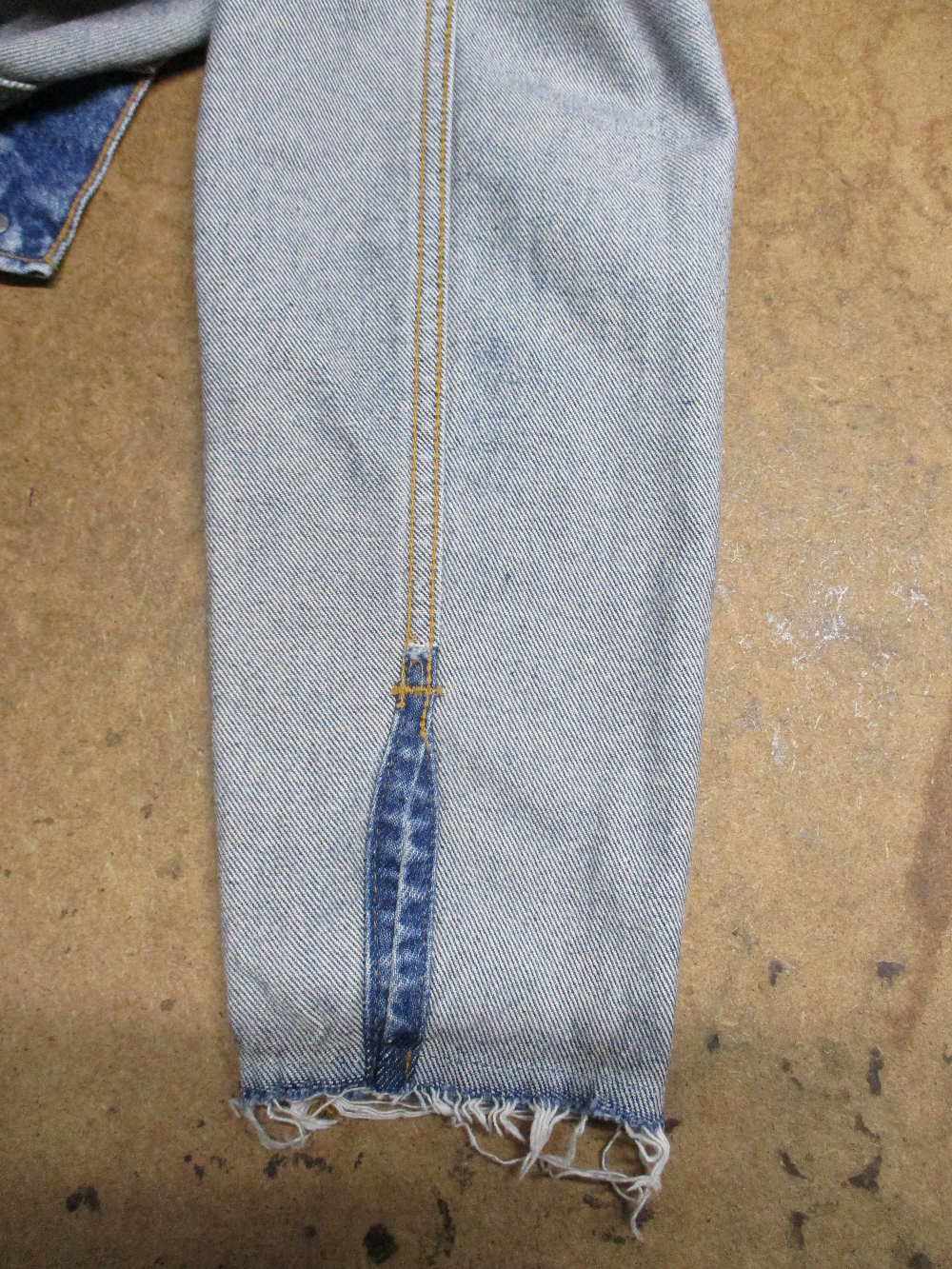 長い袖丈のリーバイスのGジャンをお客さんの好みの長さに短くリサイズしていきます。