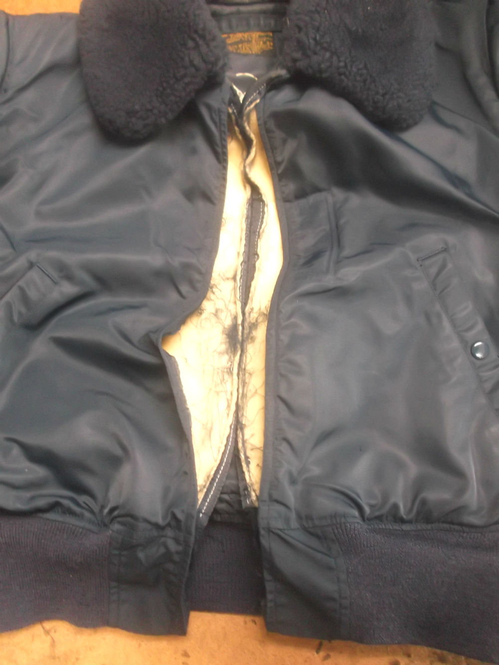1枚目は来店されたお客さんのフロントとシガーポケットをクラウンのジッパーに交換していく前のB-15フライトジャケットです。
