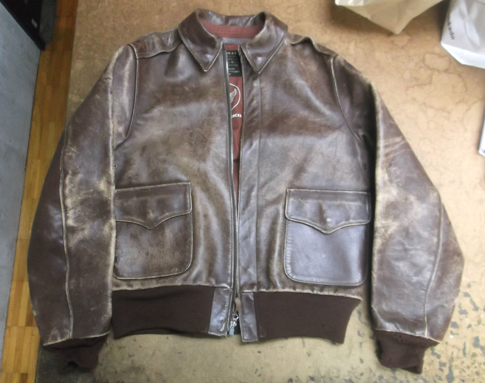 1枚目は大分県からの郵送のお客さんの両袖と腰回りを交換していく前のA-2フライトジャケットです。