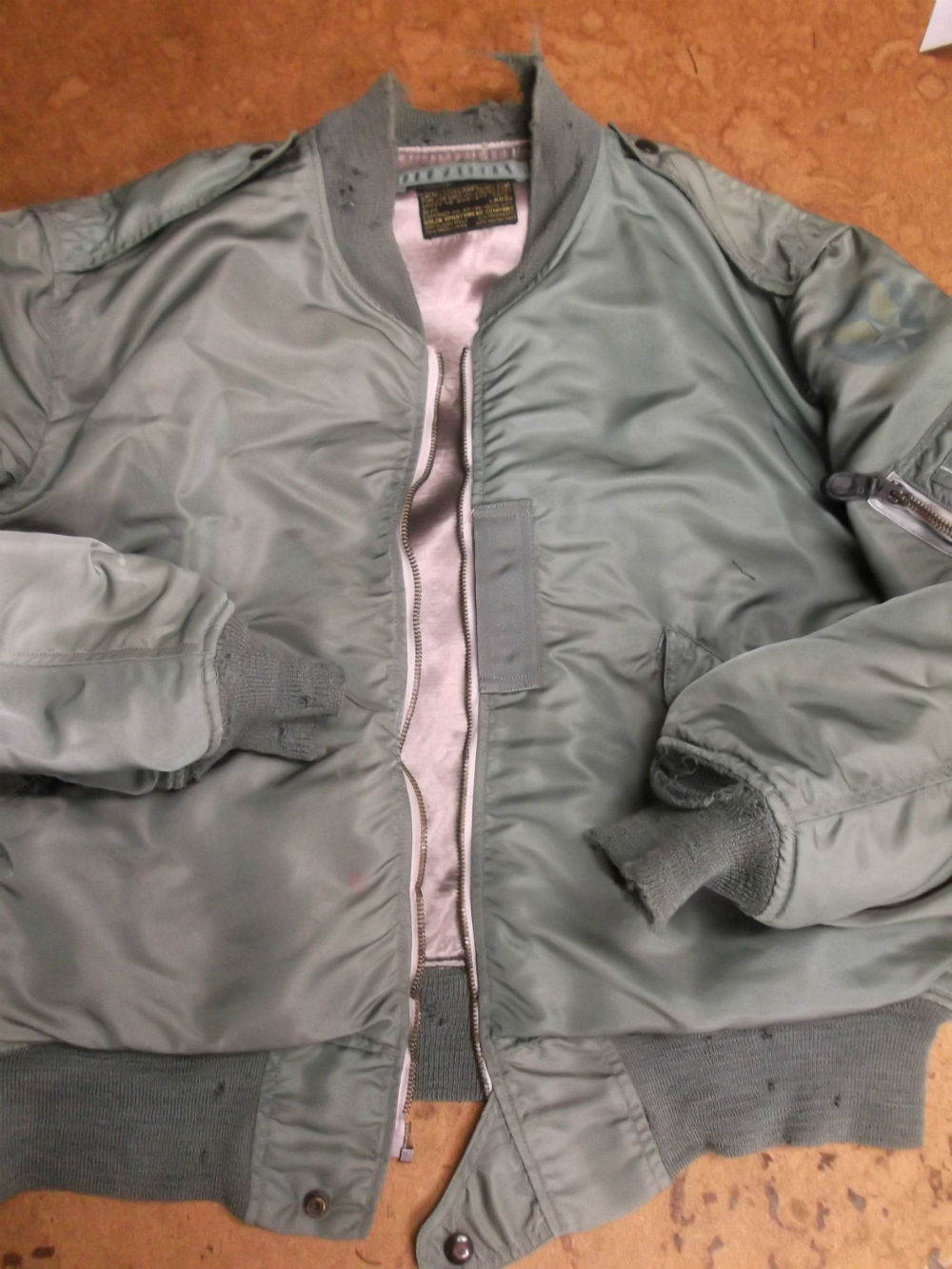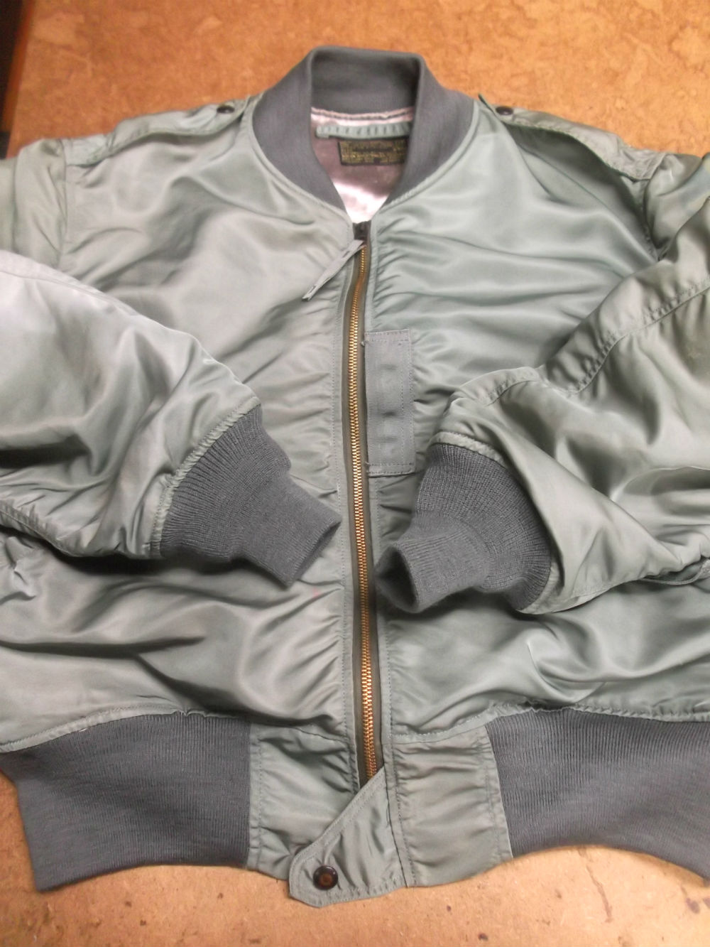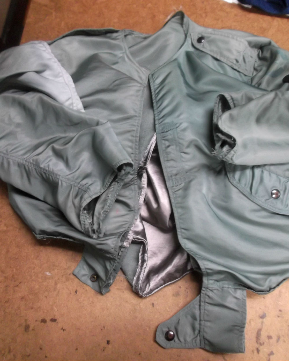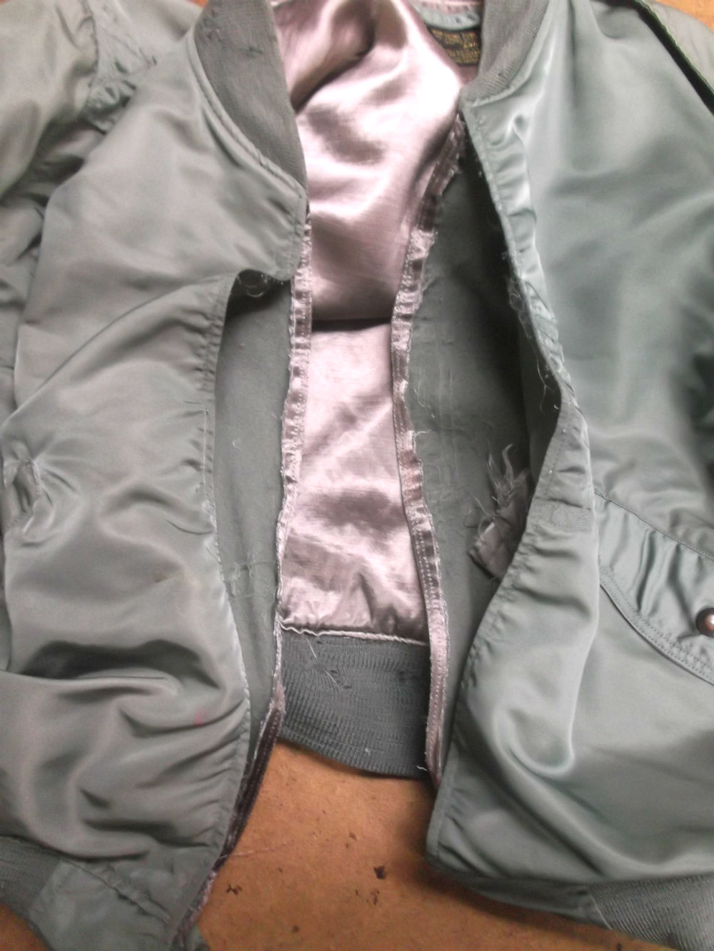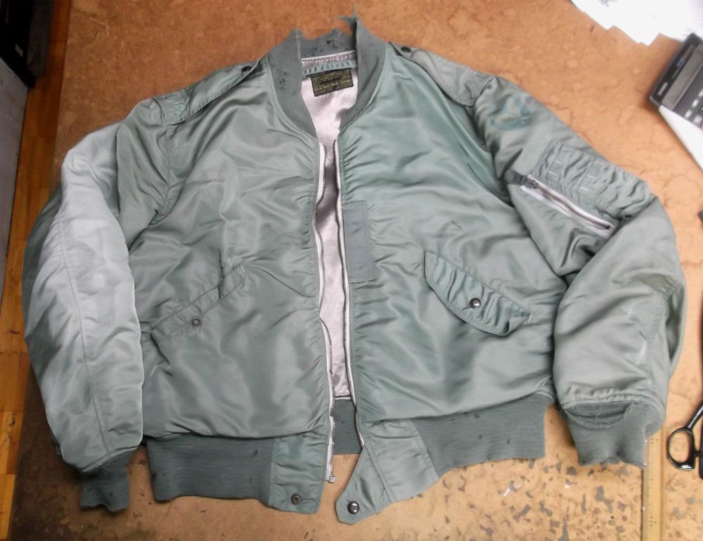1枚目は来店されたお客さんの襟、袖、腰回りとジッパーを交換していく前のL-2Bフライトジャケットです。