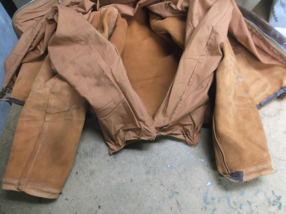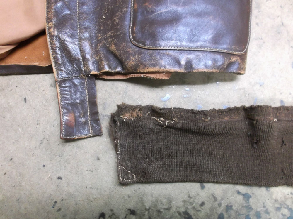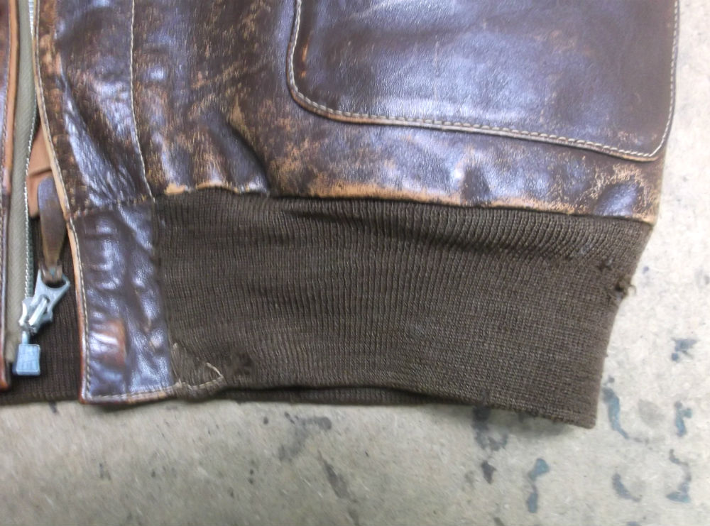 13枚目はA-2フライトジャケットに両袖と腰回りのリブニットを新しく取り付けた後の写真です。