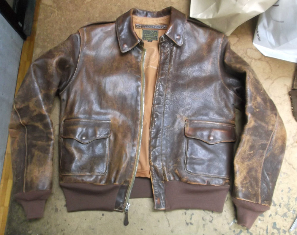 1枚目は香川県からの郵送のお客さんの両袖と腰回りのリブニットを交換していく前のA-2フライトジャケットです。