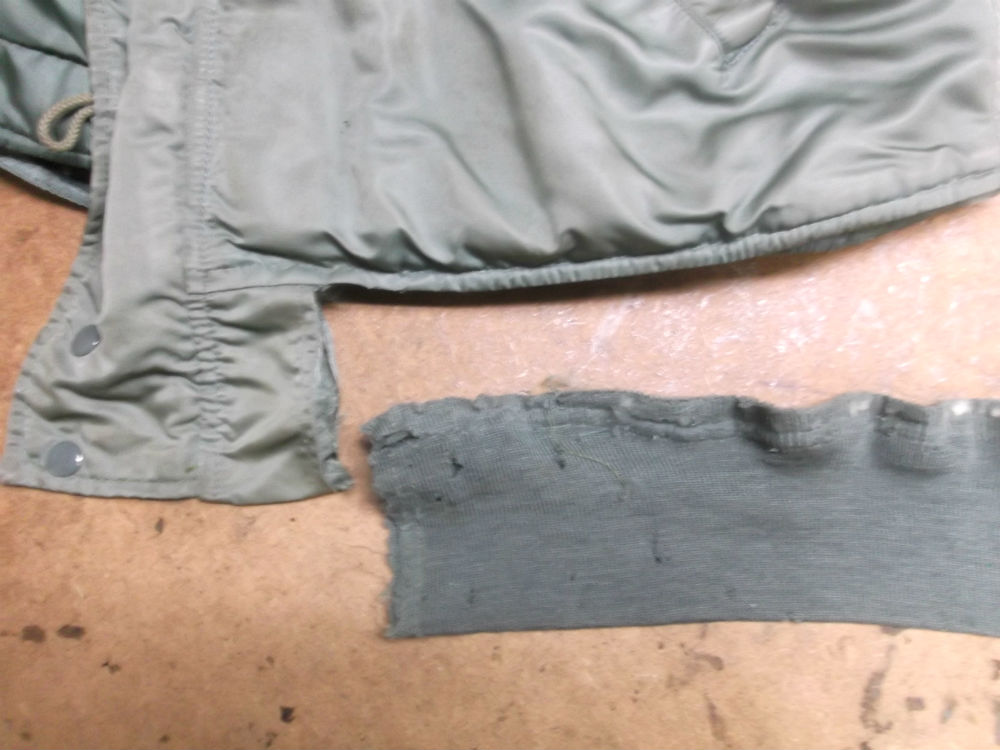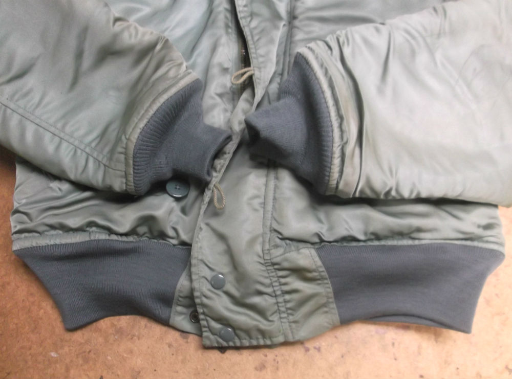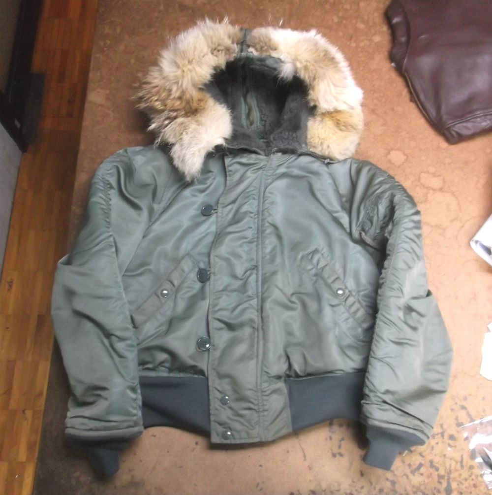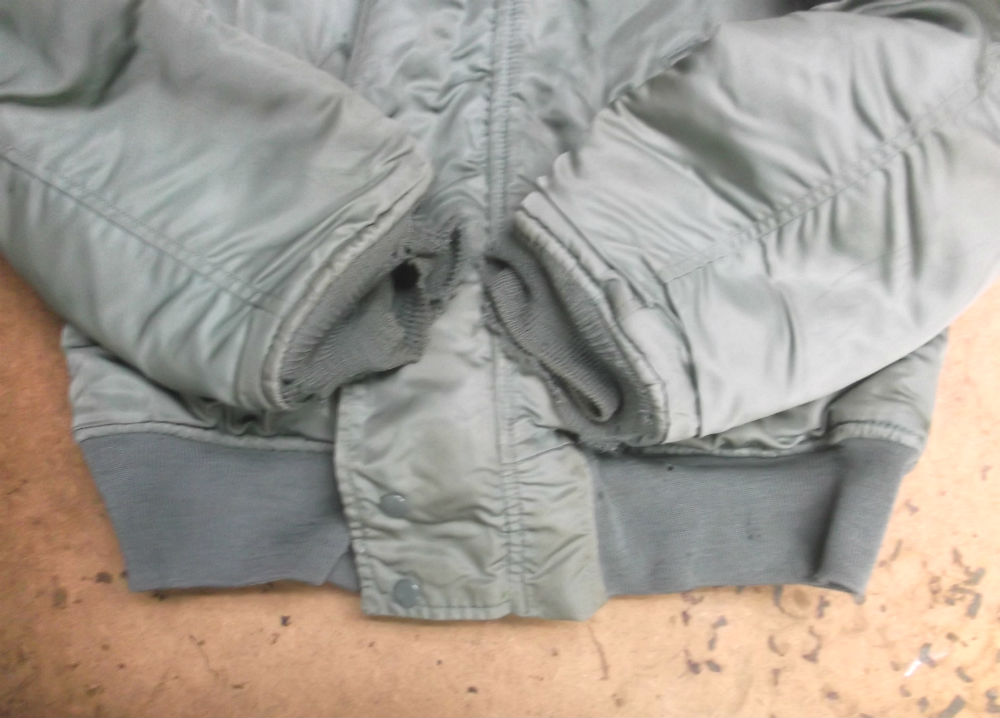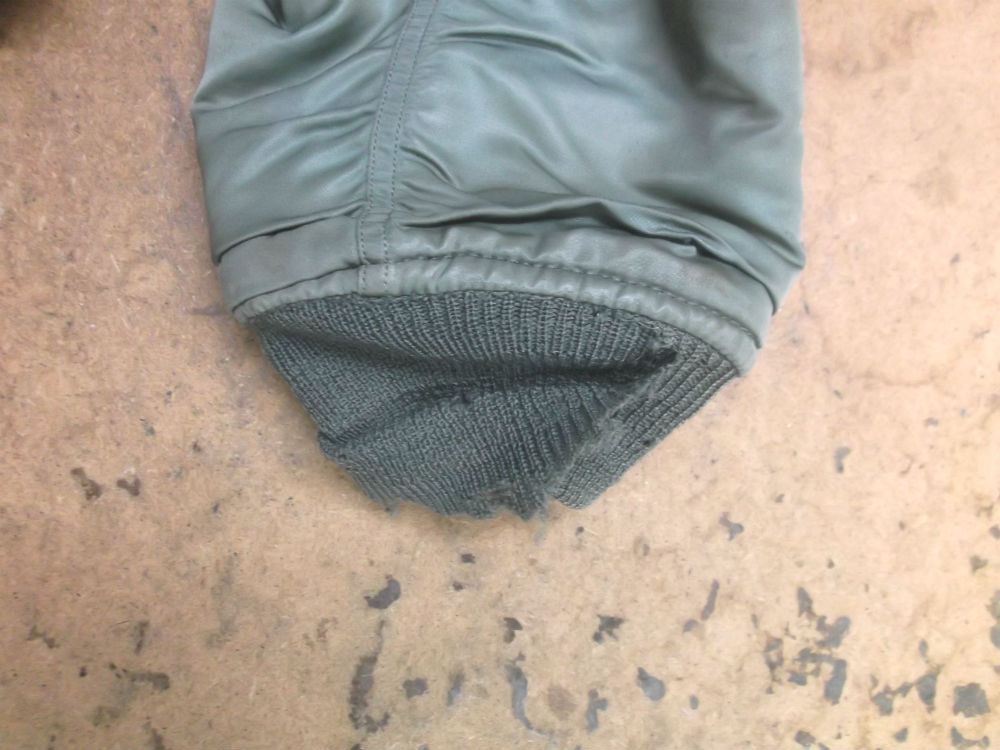 1枚目は愛知県からの郵送のお客さんの両袖と腰回りのリブニットを交換とボタンを取り付けていく前のN-2Bフライトジャケットです。