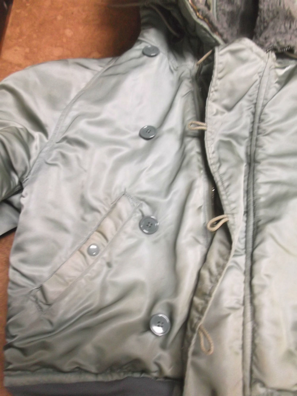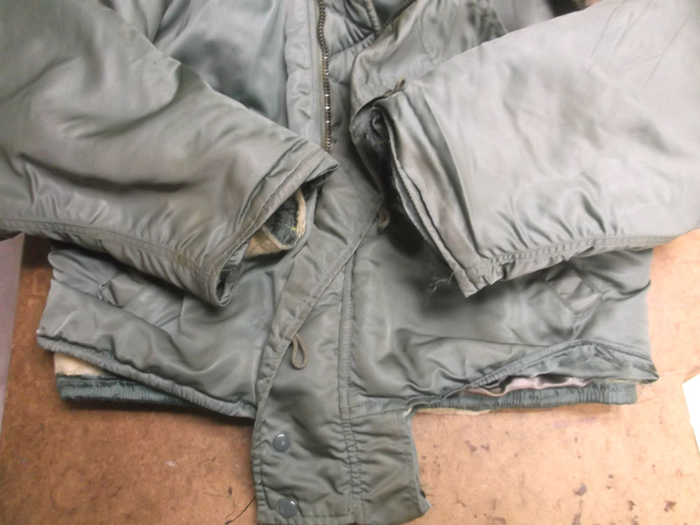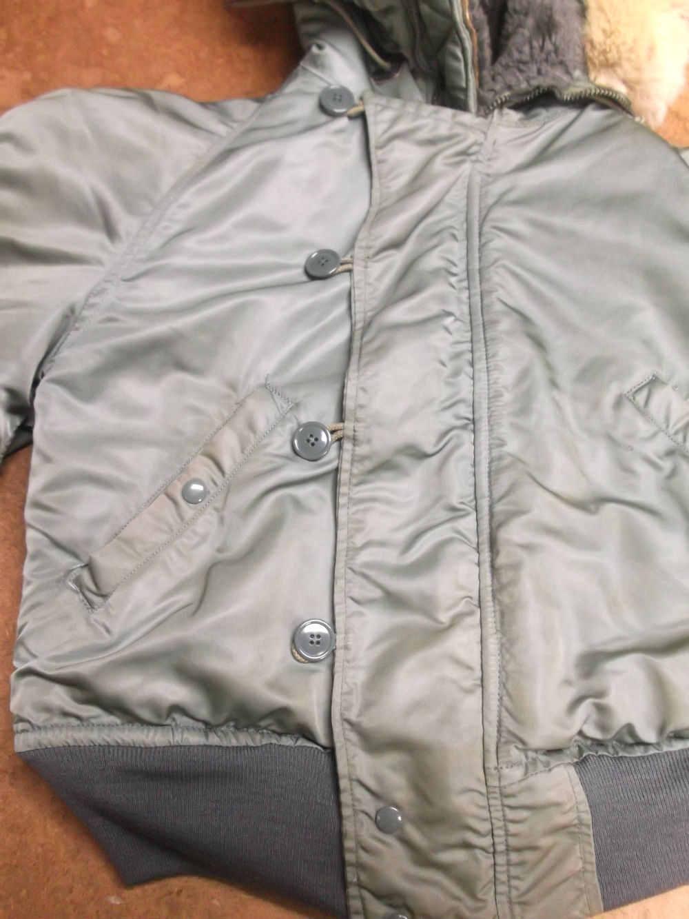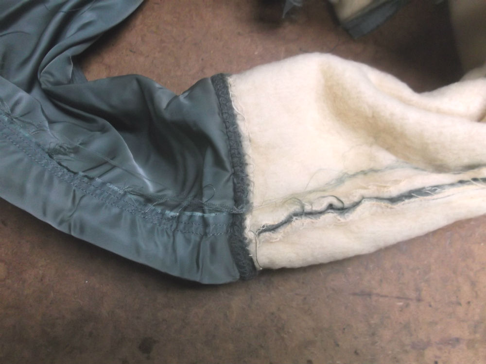 1枚目は愛知県からの郵送のお客さんの両袖と腰回りのリブニットを交換とボタンを取り付けていく前のN-2Bフライトジャケットです。
