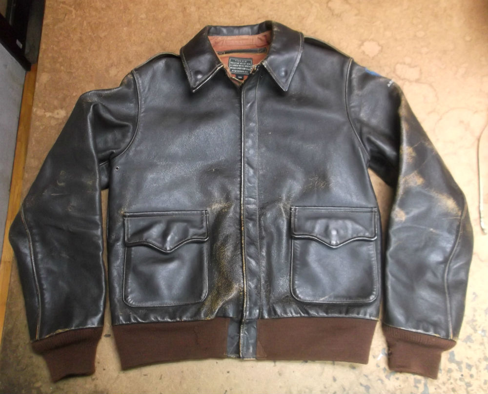 1枚目は埼玉県からの輸送のお客さんの両袖と腰回りのリブニットを交換していく前のA-2フライトジャケットです。