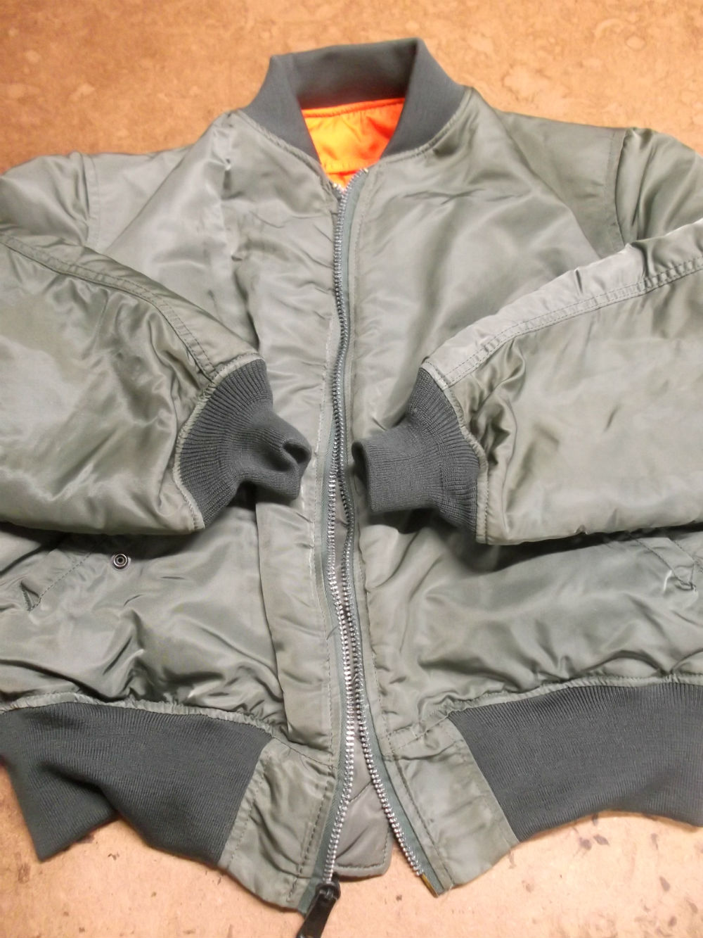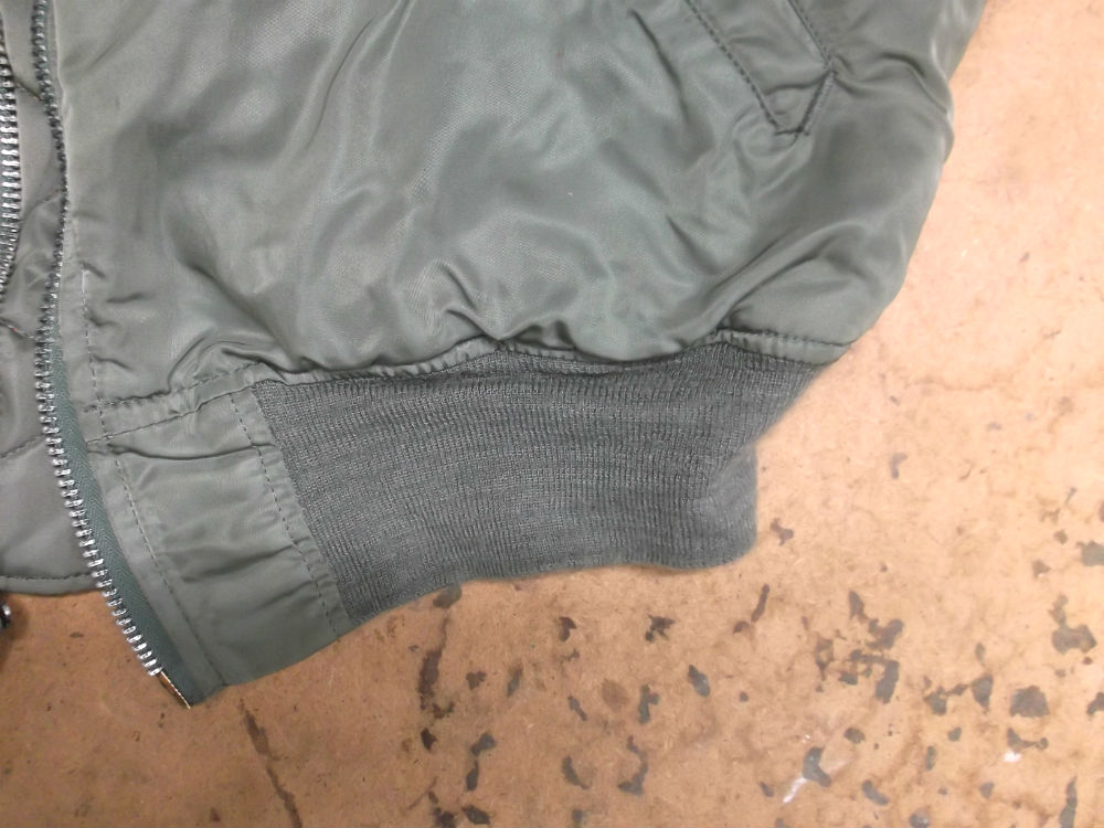 17枚目は襟、両袖、腰回りに新しいリブニットを取り付けた後のMA-1フライトジャケットの写真です。