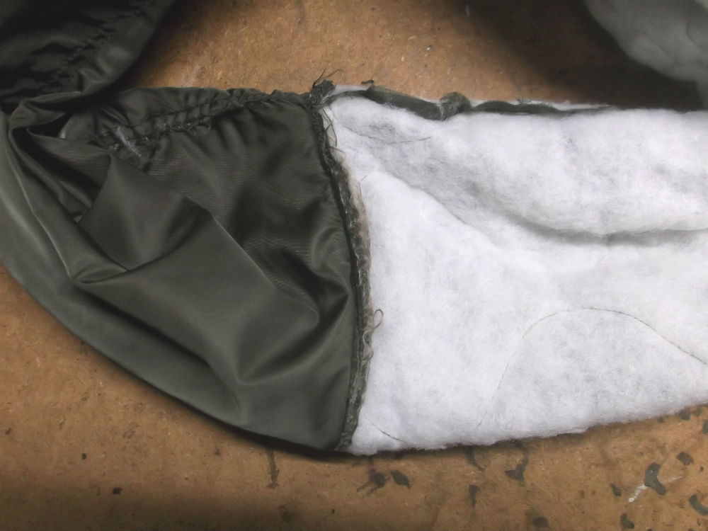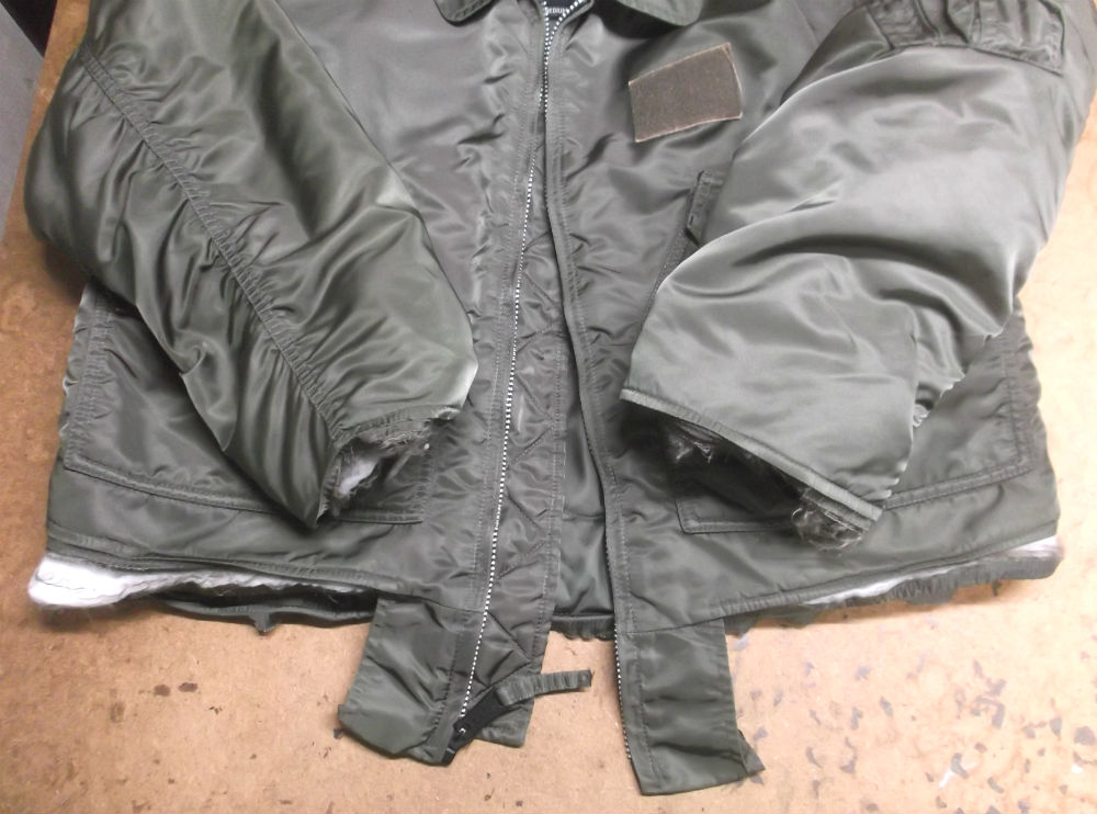 7枚目はCWU-45Pフライトジャケットから両袖と腰回りのリブニットを取り外した後の写真です。