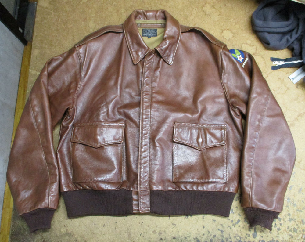 1枚目は京都府からの郵送のお客さんの両袖と腰回りのリブニットを交換していく前のA-2フライトジャケットです。