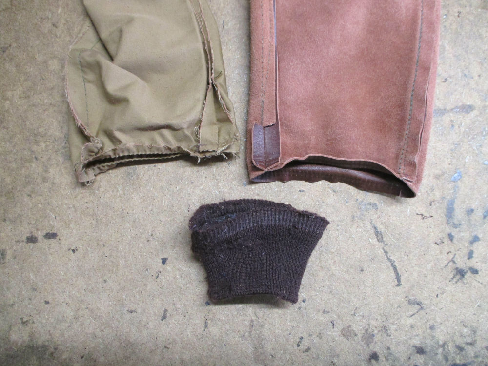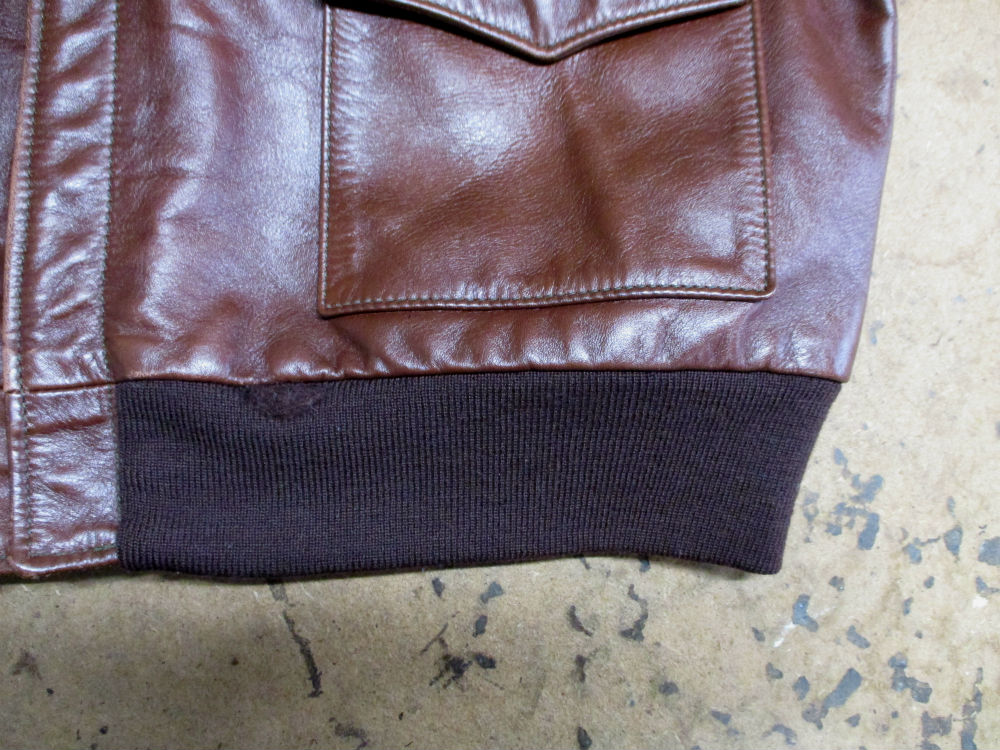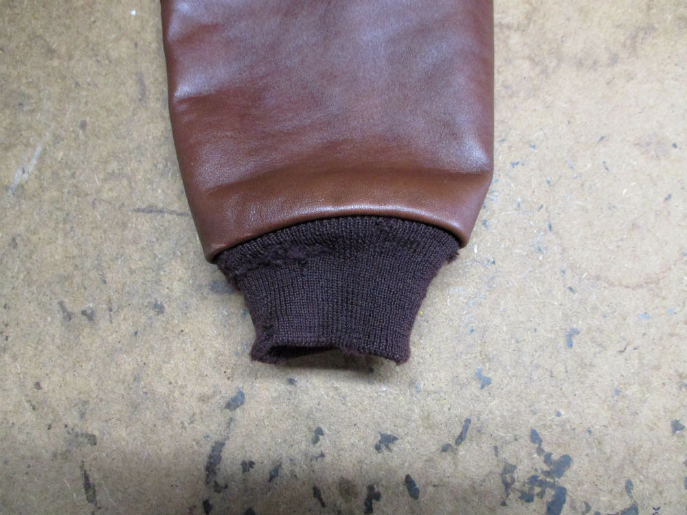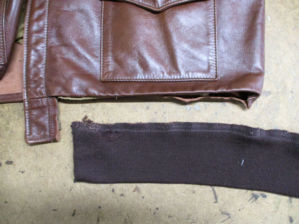 A-2フライトジャケットの所々破れだした両袖と腰回りのリブニットを新しいものに交換していきます。