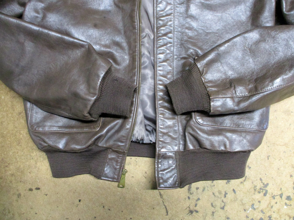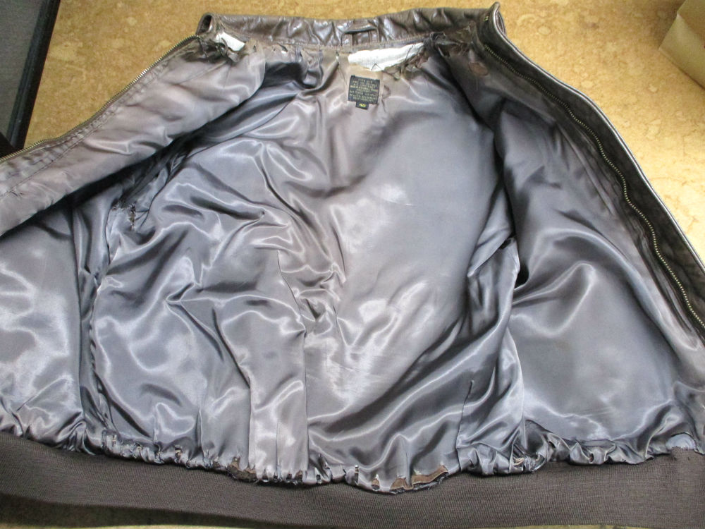 1枚目は福岡県からの郵送のお客さんの両袖と腰回りのリブニットと裏地を交換していく前のA-2フライトジャケットです。